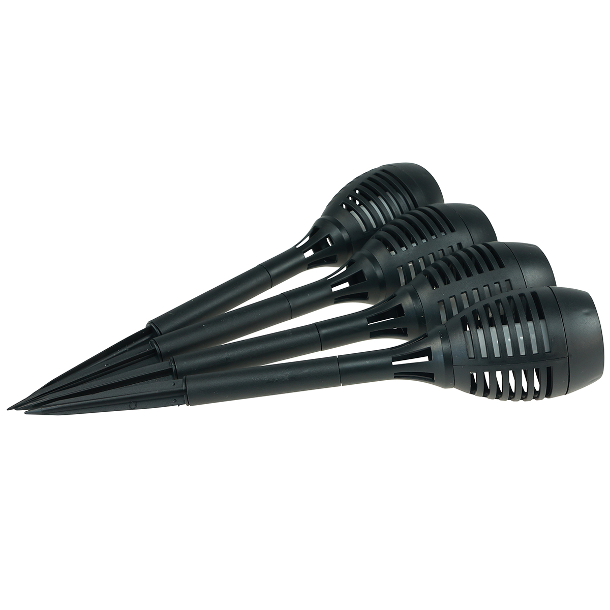 Sie erhalten die dekorative Balkon- und Gartenbeleuchtung zu 4 Stück. Die Fackeln aus schwarzem Kunststoff sind jeweils 4-teiig und bestehen aus Spieß, Stab, Fackelhalter und Fackel-Kopf.