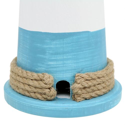 Mit diesem großen Leuchtturm in Blau aus Holz können Sie im Sommer eine Schaufensterdeko oder eine Raumdeko auf pfiffige Weise unterstützen! Dabei ist der große Holzturm in Blau, Weiß und Hellblau gefärbt, an der Unterseite mit einer Flachskordel verziert und besitzt an der Oberseite eine kleine Balustrade, die das Erscheinungsbild abrundet. Mit der breiten und runden Stellfläche können Sie den Deko-Leuchtturm in ein Schaufenster stellen und damit Reisen an die Nordsee, eine Schiffstour, leckeren Fisch oder einfach die neue Sommerkollektion bewerben.Aber auch als Raumdeko für Ihr Restaurant, eine Cocktailbar oder für ein Wartezimmer eignet sich diese nautische Dekoration richtig gut. Dabei ist der Turm auch überraschend leicht und kann sehr schnell umgeräumt werden. So können Sie auch eine Party, eine Fernsehaufzeichnung oder eine Theaterbühne im Handumdrehen damit dekorieren. Wenn Sie dazu noch eine kleine Lichterkette um den Turm wickeln und ein paar Muscheln sowie ein kleines Schiff hinzufügen, erhalten Sie eine richtig stimmungsvolle maritime Dekoration!