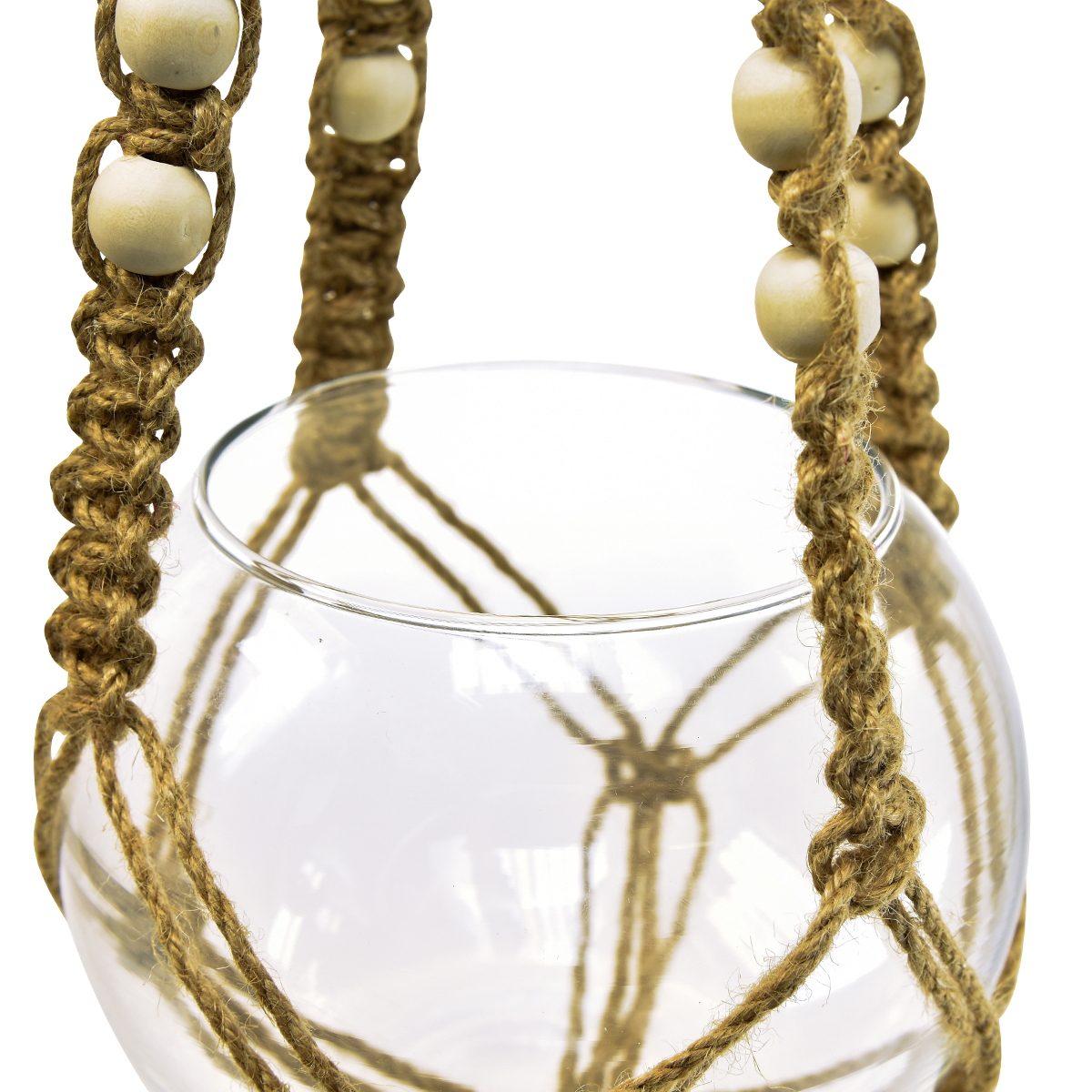 In das Makramee eingeflochten sind an jedem Strang acht Holzperlen in Weiß. Die weißen Perlen erlauben ein harmonisches Gesamtbild zu dem eher dunkleren Naturton des Makramee und der glasklaren runden Glasvase.