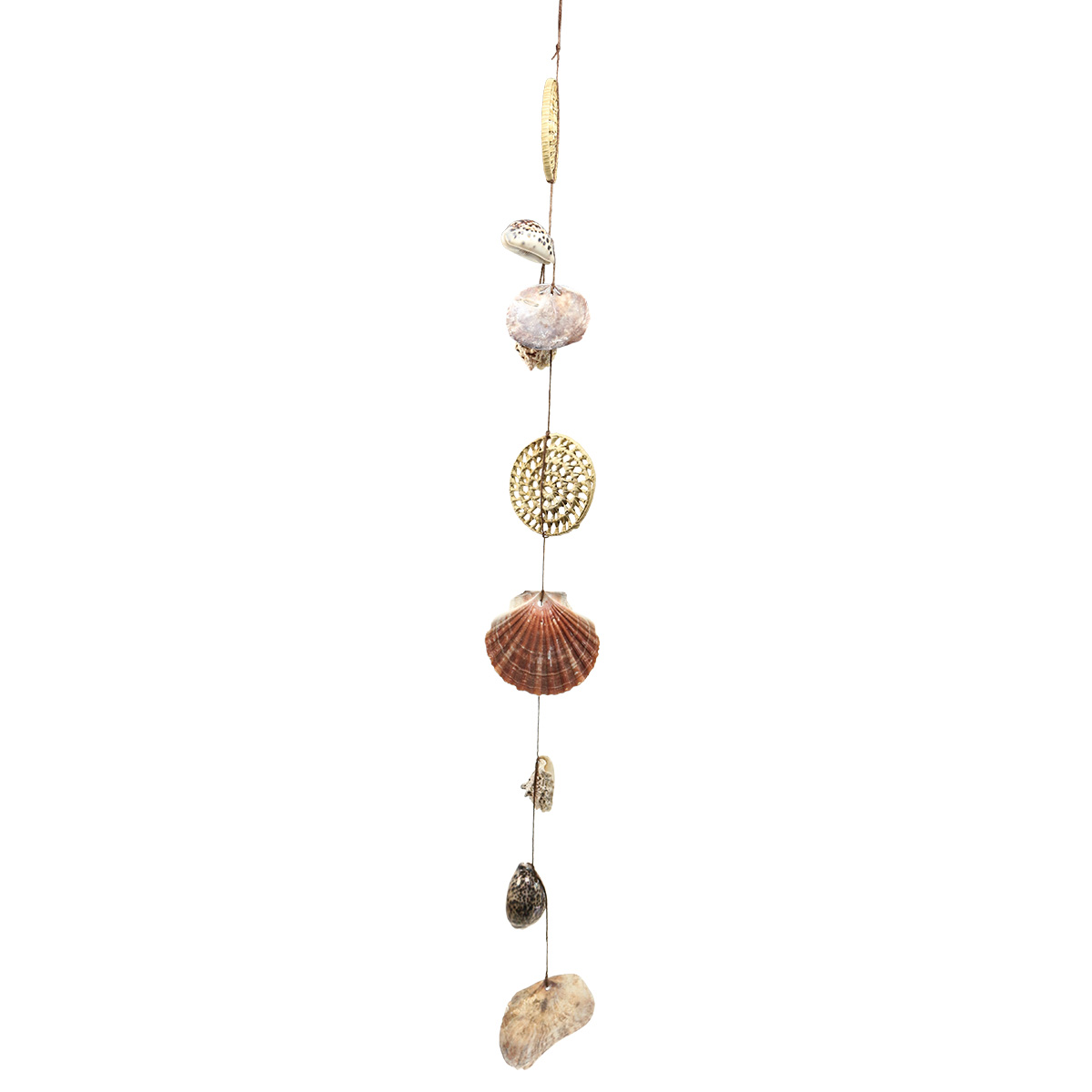 Die Muschelgirlande bringt mit ihrer schönen Optik traumhafte Südsee-Stimmung in die eigenen vier Wände, den Balkon oder Ihren Garten. An einem braunen Naturband sind für die hübsche Hängedeko mit Muscheln unregelmäßig abwechselnd Capiz-Perlmutt-Muscheln, verschiedene Meeresschneckenhäuser und Jakobsmuscheln sowie runden Geflechte aus Seegras angeknüpft. Am Ende der Hängedeko für den Sommer befindet sich eine geknotete Schlaufe, die direkt zum Aufhängen des Wandschmucks dienen kann.