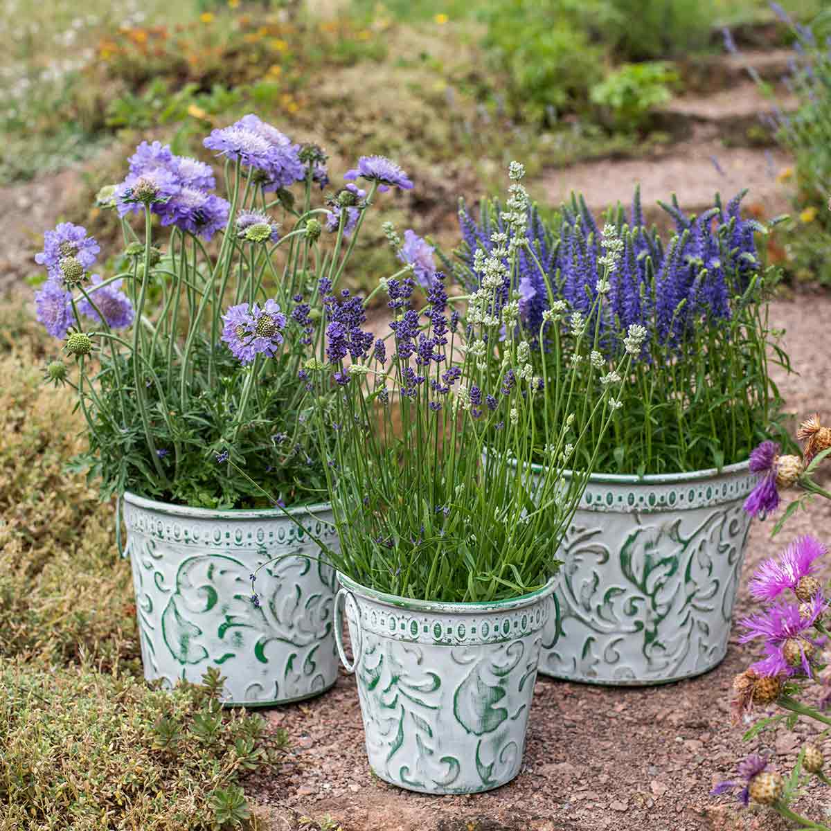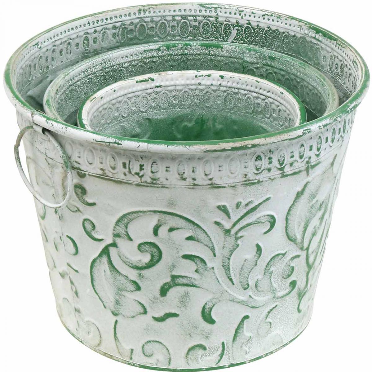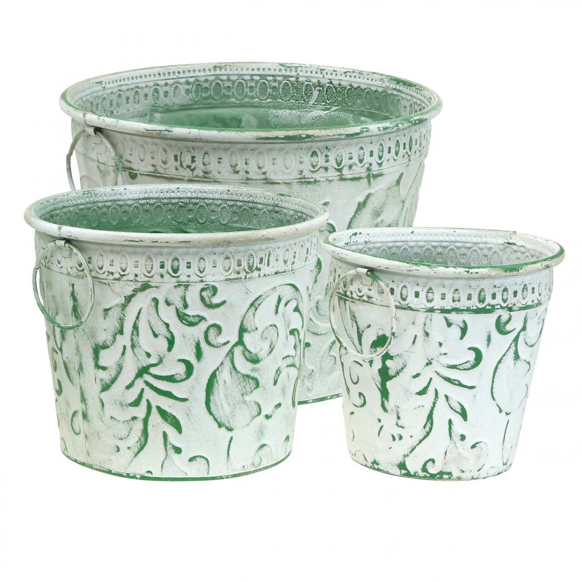 Produktname: Metall-Töpfe mit Henkeln, Pflanzkübel mit Prägung Weiß, Grün Shabby Chic H20,5/18,5/16cm Ø25,5/20,5/15,5cm 3er-Set