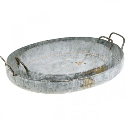 Metallschale mit Griffen, Pflanzgefäß, Dekotablett Antik-Optik Weiß gewaschen L51/40,5cm 2er-Set
