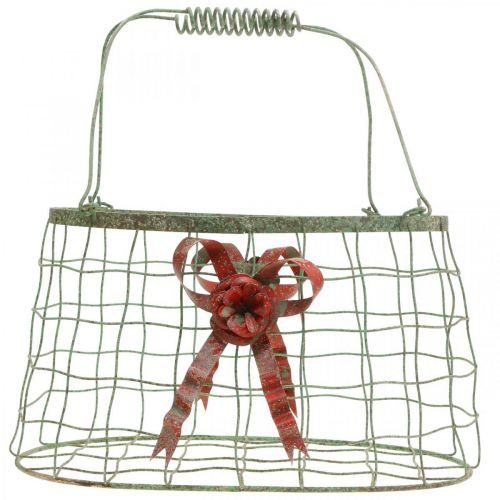 Dieses Pflanzgefäß ist ein wirklich entzückender Henkelkorb im Stil einer metallenen Handtasche. Der hübsche Drahtkorb mit Henkeln besteht aus einem künstlich gealterten Drahtgeflecht mit Anklängen von Rost und Grünspan. An beiden Seiten schmücken jeweils eine große Schleife in Rot, aus metallenen Band gefertigt und mit einer roten Rose im Zentrum der Schleife verziert, den großen Drahtkorb. Auch das Schleifendekor ist im Stil des antiken Shabby Chic, mit Ablagerungen und Farbabtragungen versehen. Gebogene Henkel mit zu Spiralen gedrehten Griffen vervollständigen die Optik der metallene Handtasche.Tipp: Der schöne Korb mit Griffen im Stil einer Henkeltasche kann auch ganz wunderbar mit dem kleineren Pflanzkorb im selben Stil, aus unserem umfangreichen Sortiment an Pflanztöpfen aus Metallgeflecht, kombiniert werden!