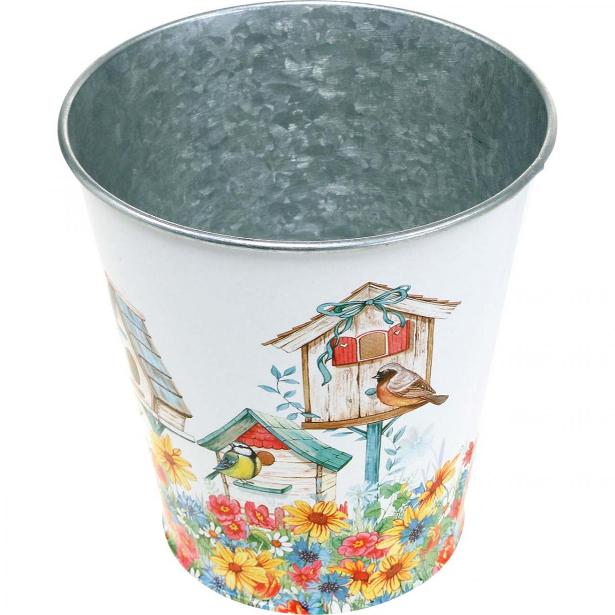 Metalltopf mit Motiv, Pflanzgefäß mit Vogelhäusern, Blecheimer H13cm Ø11,5cm