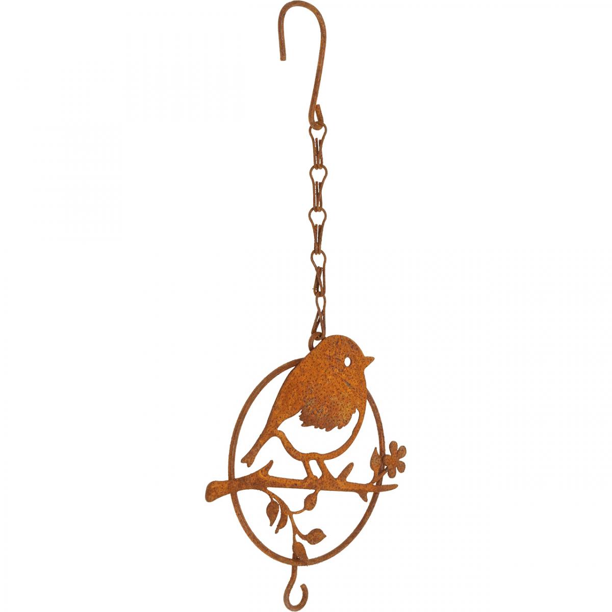 Die Metalldeko in Rost-Optik ist mit einer Kette mit Haken zum Aufhängen oben und einem kleinen Haken an der Unterseite ausgestattet.