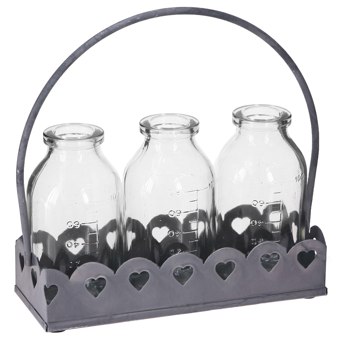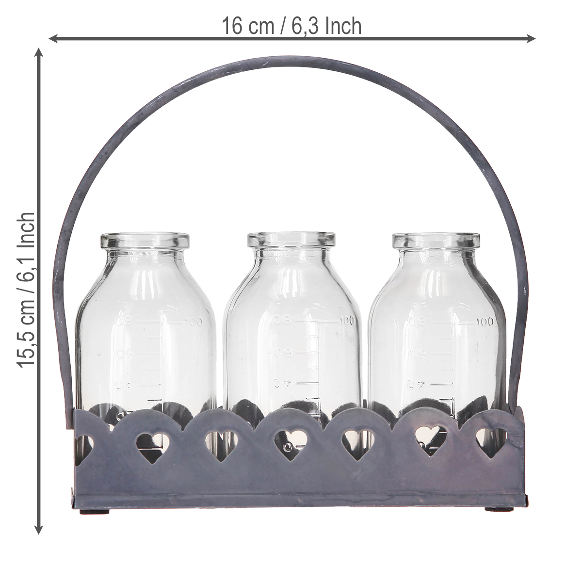 Erleben Sie die zauberhafte Anziehungskraft der Mini-Flaschen-Deko als Vasen auf einem Tablett. Diese charmanten Dekoflaschen sind perfekt, um Ihrem Wohnraum einen Hauch von Nostalgie zu verleihen. Jede der drei Glasvasen erinnert an antike Apothekerfläschchen und ist auf einem robusten, grauen Metalltablett mit ausgestanzten Herzmotiven platziert. Dieses Detail im Retro-Stil verleiht dem Arrangement eine romantische Note, die ideal für Hochzeitsdeko, gemütliche Tischdekorationen oder als Geschenkidee geeignet ist. Die Maße auf den Flaschen eröffnen vielseitige Verwendungszwecke, von der schnellen Bepflanzung kleiner Blumenarrangements bis zur Aufbewahrung von Kräutern oder Bastelmaterialien.