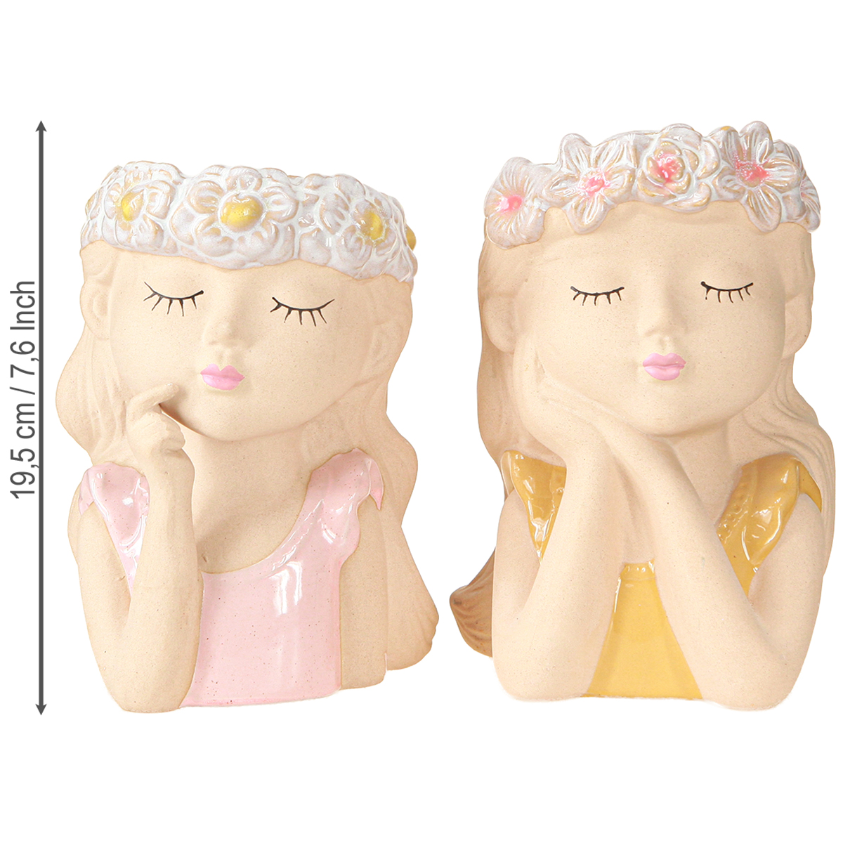 Die beiden teilglasierten Übertopfe erhalten Sie farblich sortiert mit rosa und beiger Bluse, wobei die Keramik-Figuren verschiedene Posen einnehmen. So erscheint eines der Mädchen verträumter, das andere nachdenklicher. Deshalb eignen sich die Figuren perfekt dafür, sie paarweise auf einem langen Tisch, auf Fensterbänken, einem Sideboard oder im Wohnzimmer-Regal aufzustellen. Passende Trockenblumen für diese Keramikvasen erhalten Sie ebenfalls hier im Shop von Floristik24!