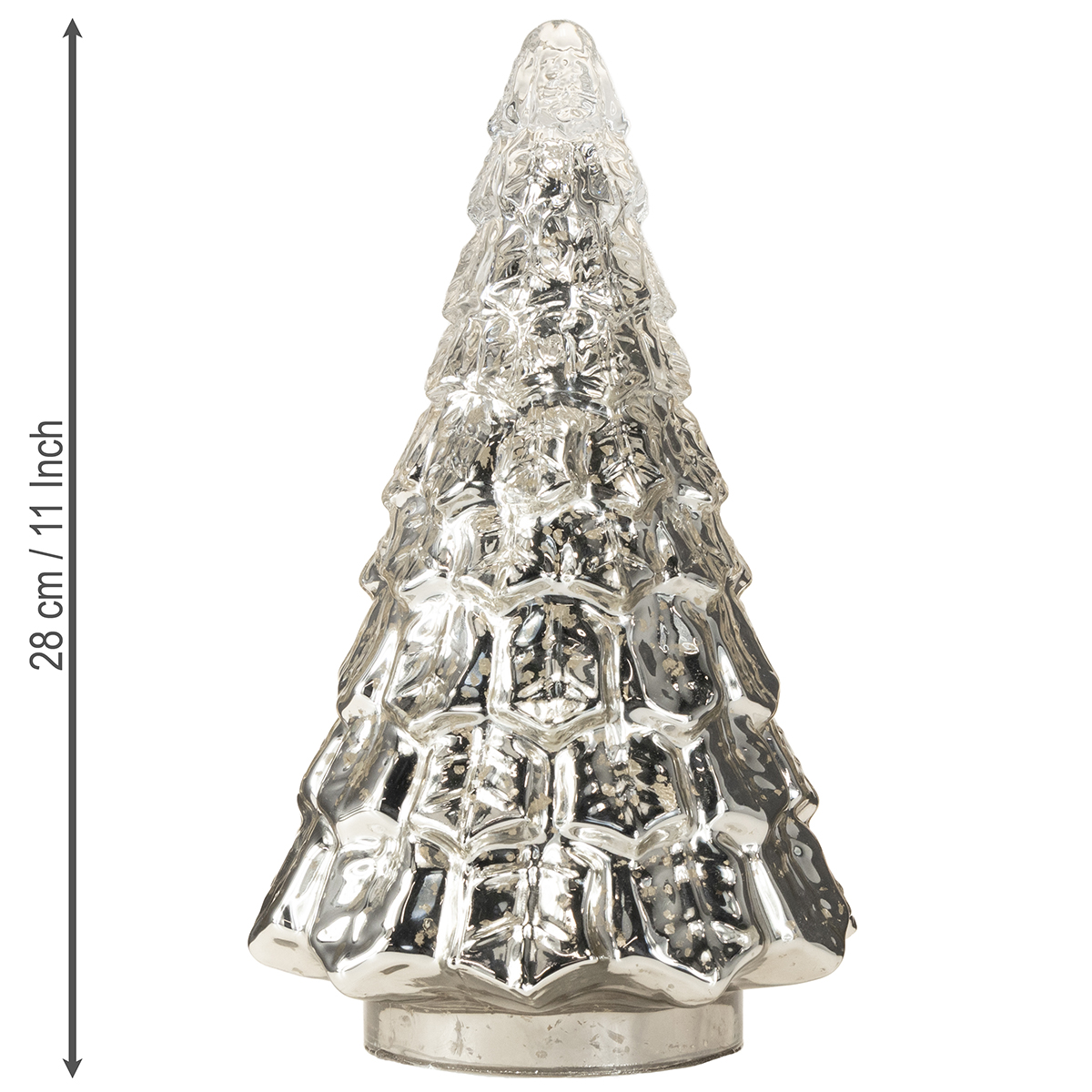 Suchen Sie nach einer besonderen und stimmungsvollen Deko für die Weihnachtszeit? Der Mini-Weihnachtsbaum mit LED-Beleuchtung ist in Silber die perfekte Wahl, wenn Sie die Wohnung oder das Büro mit Eleganz und Festlichkeit schmücken möchten. Mit einer Höhe von circa 28 cm ist er ein Hingucker, der nostalgische und moderne Elemente vereint – ideal für das Wohnzimmer, den Eingangsbereich oder auch Ihren Schreibtisch. Die feinen, golden schimmernden Sprenkel scheinen durch die im Vintage-Stil stellenweise abgetragene Silberfarbe, so dass der Baum dank der LED-Beleuchtung ein warmes, sanftes Licht ausstrahlt. Die Spitze ist transparent, was die Strahlkraft des Tannenbäumchens noch erhöht.