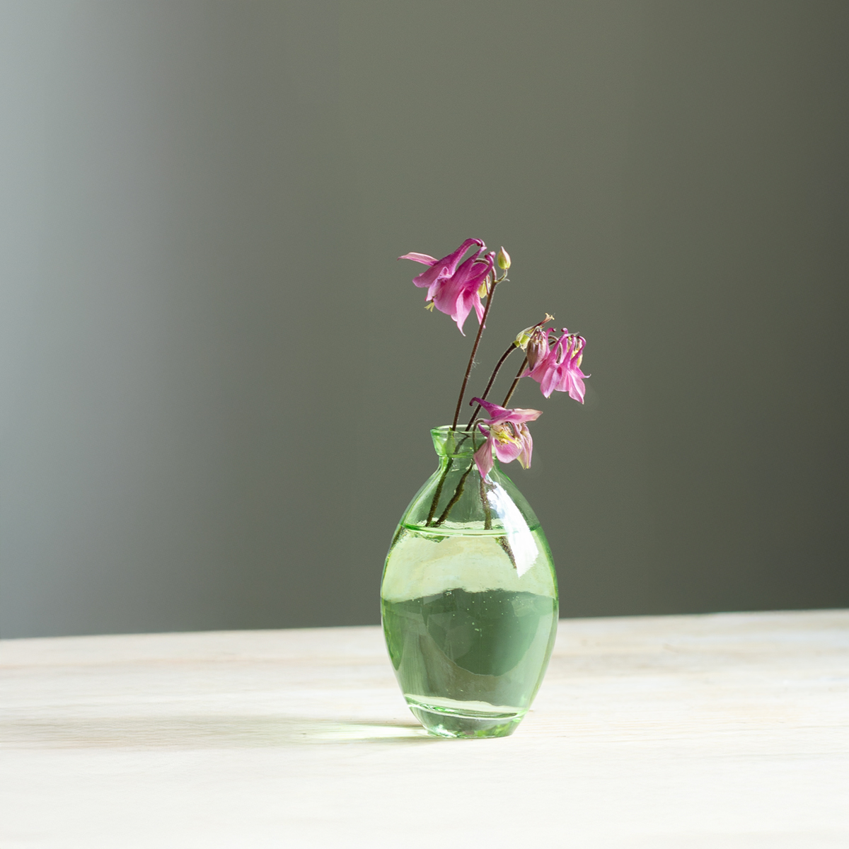 Stilvolle bauchige Minivasen aus grün getöntem Glas für Ihre Tischdekoration