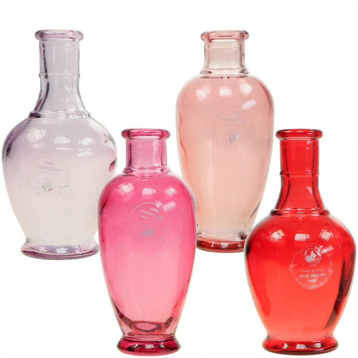 Die vier entzückenden Glasvasen sind schon etwas größere Minivasen. Die Glas-Deko ist sommerfrisch in den unterschiedlichsten Rot-Tönen gefärbt.Zweifach sortiert in der Form, sind die Mini-Vasen doch alle unterschiedlich. Denn Sie erhalten die Mini-Vasen in vier unterschiedlichen Farben. Schlank zeigen sich die rosa und die hellrosa bis bräunliche Glasvase. Bauchig dagegen sind die rote und die helllila Deko-Vase aus Glas.