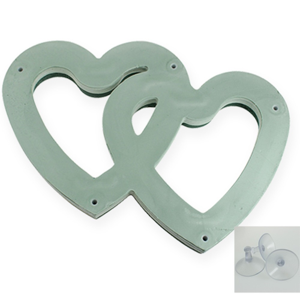 Das Duoherz aus Nass-Steckschaum mit Sauger wird als Doppelpack geliefert; somit erhalten Sie 2 Doppelherzen zum Dekorieren. Jedes Duo-Herz hat in etwa die Größe 37 x 58 x 5 Zentimeter und hat einen Boden aus Hartschaum. Sie erhalten pro Duoherz insgesamt vier Saugnäpfe.