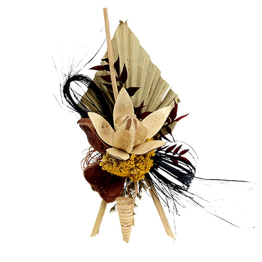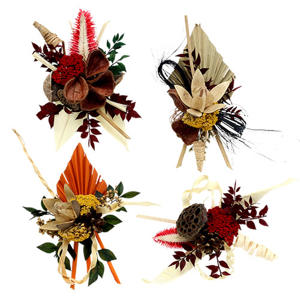 Die anmutigen Natur-Auflagen sind jeweils mit zwei langen Patenthaften ausgestattet und können somit kunstvoll in Trauergestecke und Grabkränze eingebunden und beispielsweise in Steckmasse, Tannengrün oder Stroh fixiert werden. Der sortierte Mix hält hierbei vier wundervolle Motive für Sie bereit, die geschmackvoll aufeinander abgestimmt sind. Verarbeitet wurden neben Palmspear und Lotoskolben unter anderem getrocknete Achillea, auch Schafgarbe genannt, Wildlilien, Scaletta Schoten, Cane Spring und Canella. Jede einzelne Auflage aus dem Set wurde liebevoll zusammengestellt und kunstfertig arrangiert.