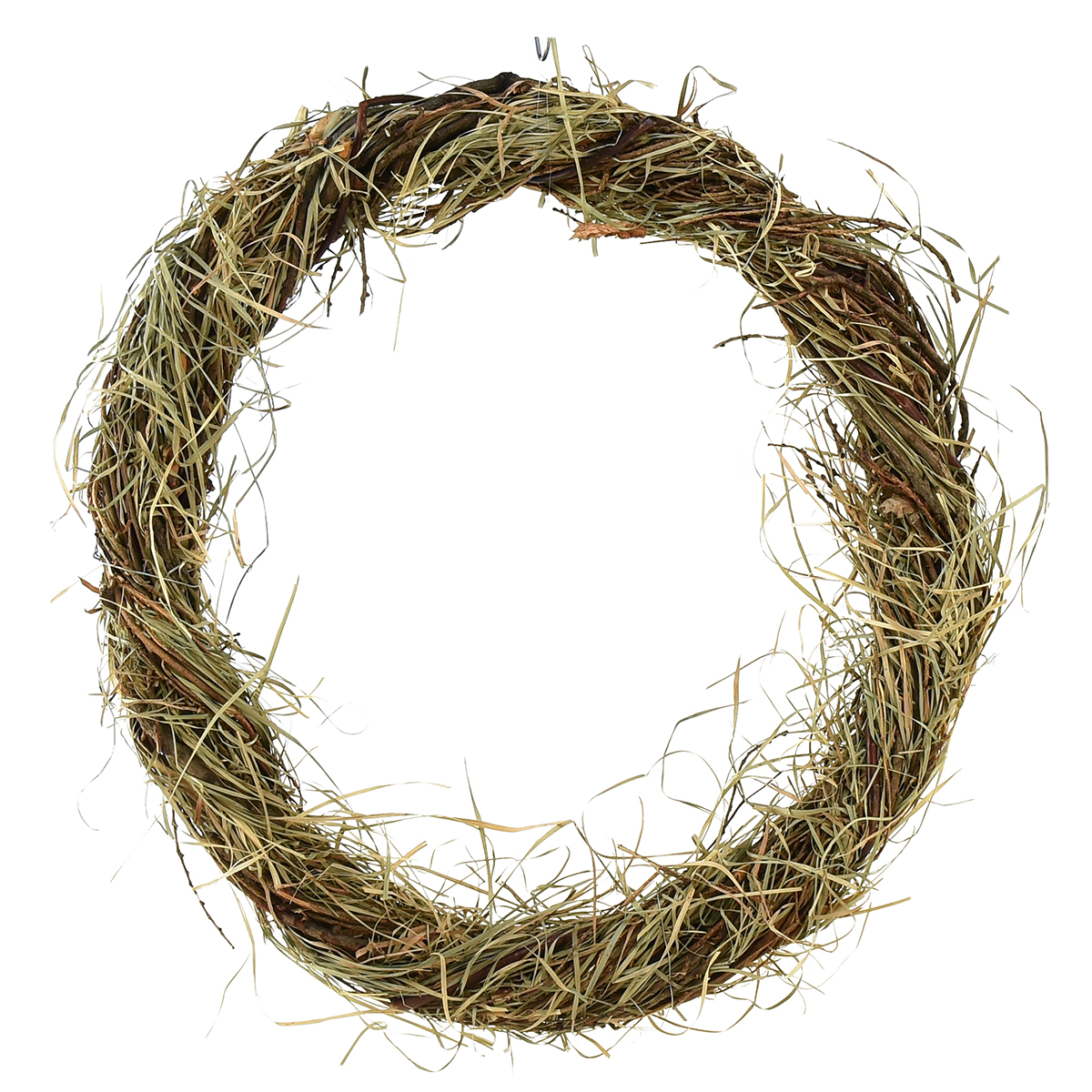 Der Naturkranz wurde aus Rebenzweigen gefertigt, die mit den Grashalmen zu einem Reif gewunden worden sind. Eine Stelle ist mit Draht befestigt, um das gewundene Ensemble sicher und stabil zu halten.