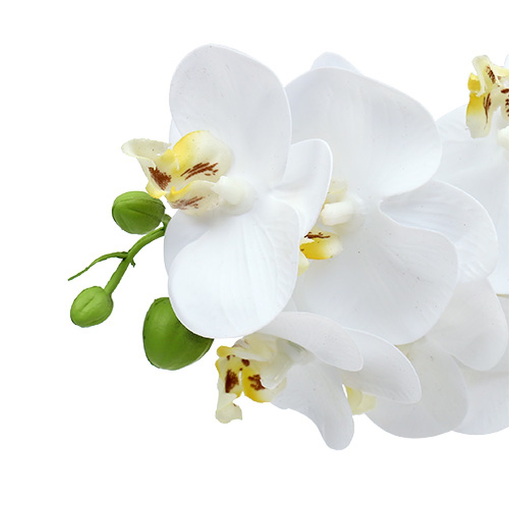 Der Orchideenzweig in Weiß ist circa 58 Zentimeter lang und seine zwölf geöffneten Blütenköpfe besitzen einen Durchmesser von etwa 6 Zentimetern und werden an der Spitze des Stiels von drei geschlossenen Blüten gekrönt. Damit der Zweig auch stabil und aufrecht steht, befindet sich im Kern ein Metallstab. Ganz zauberhaft sind auch die kleinen Blütenzungen, die in Gelb mit violetten Sprenkeln verziert sind. Lassen Sie sich von dieser aufreizenden Kunstblume begeistern!
