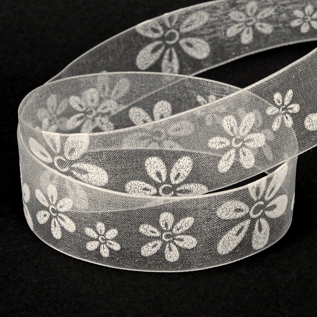 Das Stoffband ist durchscheinend und glänzt wunderschön. Das abwechslungsreiche weiße Blütenmuster ist hingegen nicht transparent. Dadurch kommen die Blumen auf Geschenkpapier umso schöner zur Geltung.