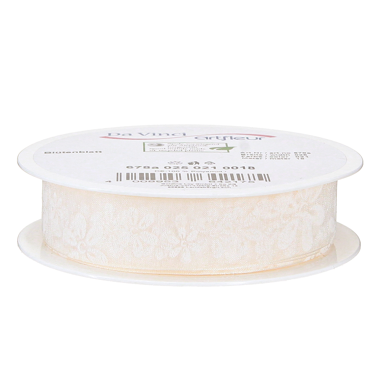 Sie erhalten 18 Meter feines Organzaband auf einer praktischen, recycelbaren Kunststoffspule. Dieses hauchfeine Organzaband mit Blütenmuster finden Sie in unserem Shop übrigens auch separat in hellem Grün oder Rosa – genau richtig für die erlesene Frühlingsdeko!