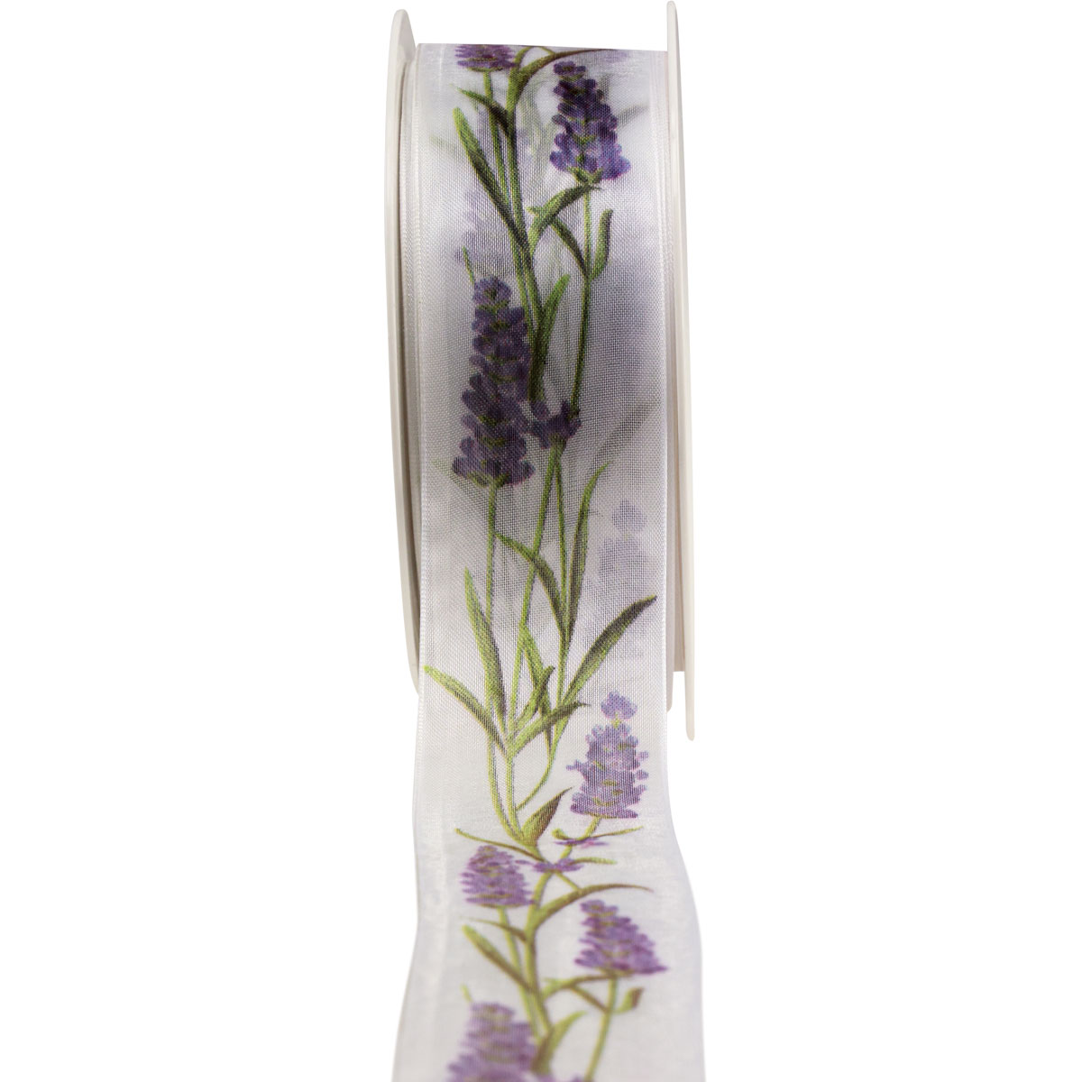 Das Lavendel-Motiv wirkt auf dem weißen Grund des Organzabandes frisch und farbenfroh. Mit seinem transparenten Organza-Gewebe präsentiert sich das Chiffonband leicht und mit charakteristischem Schimmer, während die formstabilen Kanten sicherstellen, dass Schleifen malerisch aussehen.