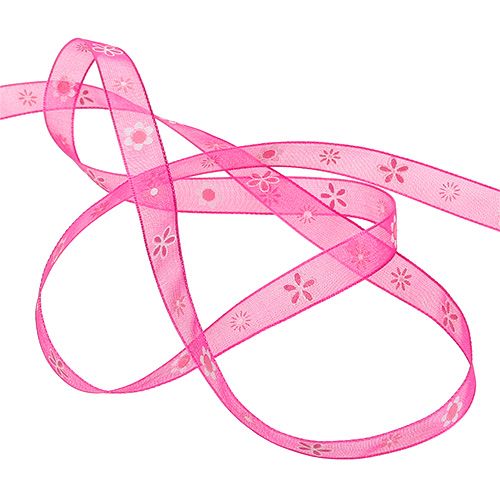Das Organzaband in Pink mit Muster aus Blumen ist auf eine Rolle aus Kunststoff gewickelt und hat eine Länge von etwa 20 Metern bei einer Breite von ungefähr 10 Millimetern.