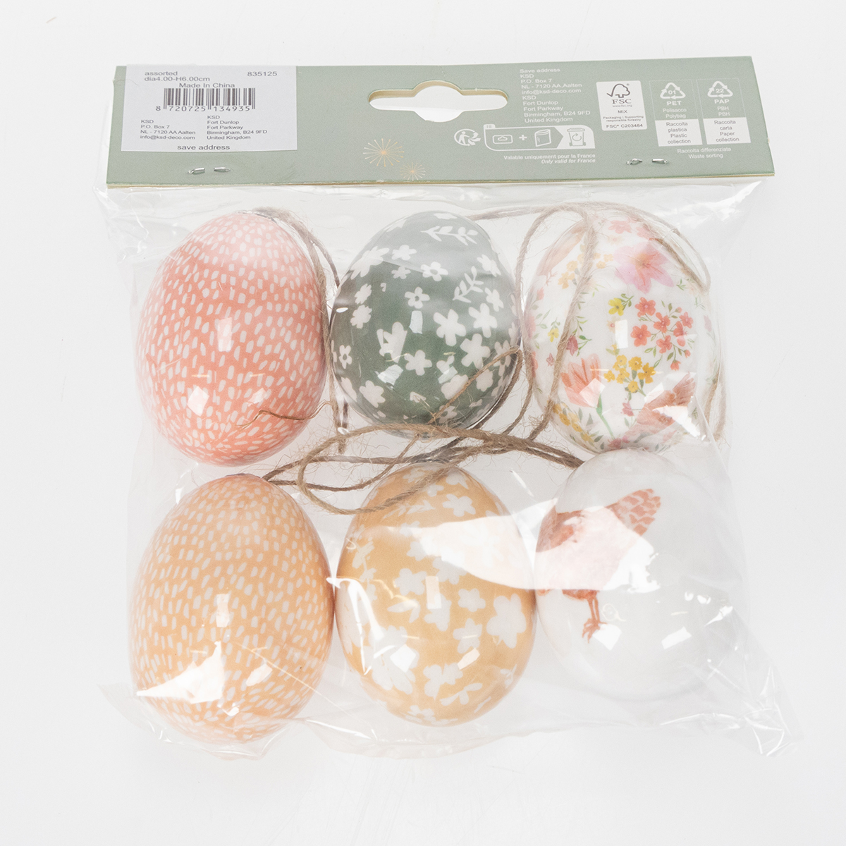 Mit einer Höhe von 6 cm und einem Durchmesser von 4 cm sind die Ostereier wunderbar proportioniert, um sowohl dezent als auch präsent zu wirken. Das Material aus stabilem Kunststoff in fröhlich-lebendigem Design macht sie besonders langlebig – ideal also für die wiederholte Verwendung in den kommenden Jahren. Die kunstvollen Muster, die in zarten Pastelltönen gehalten sind, passen perfekt zu einem modernen Look oder auch zum gemütlichen Landhausstil. Kombiniert mit anderen Dekoartikeln wie kleinen Keramikhäschen oder feinem Moos wirken sie besonders harmonisch.
