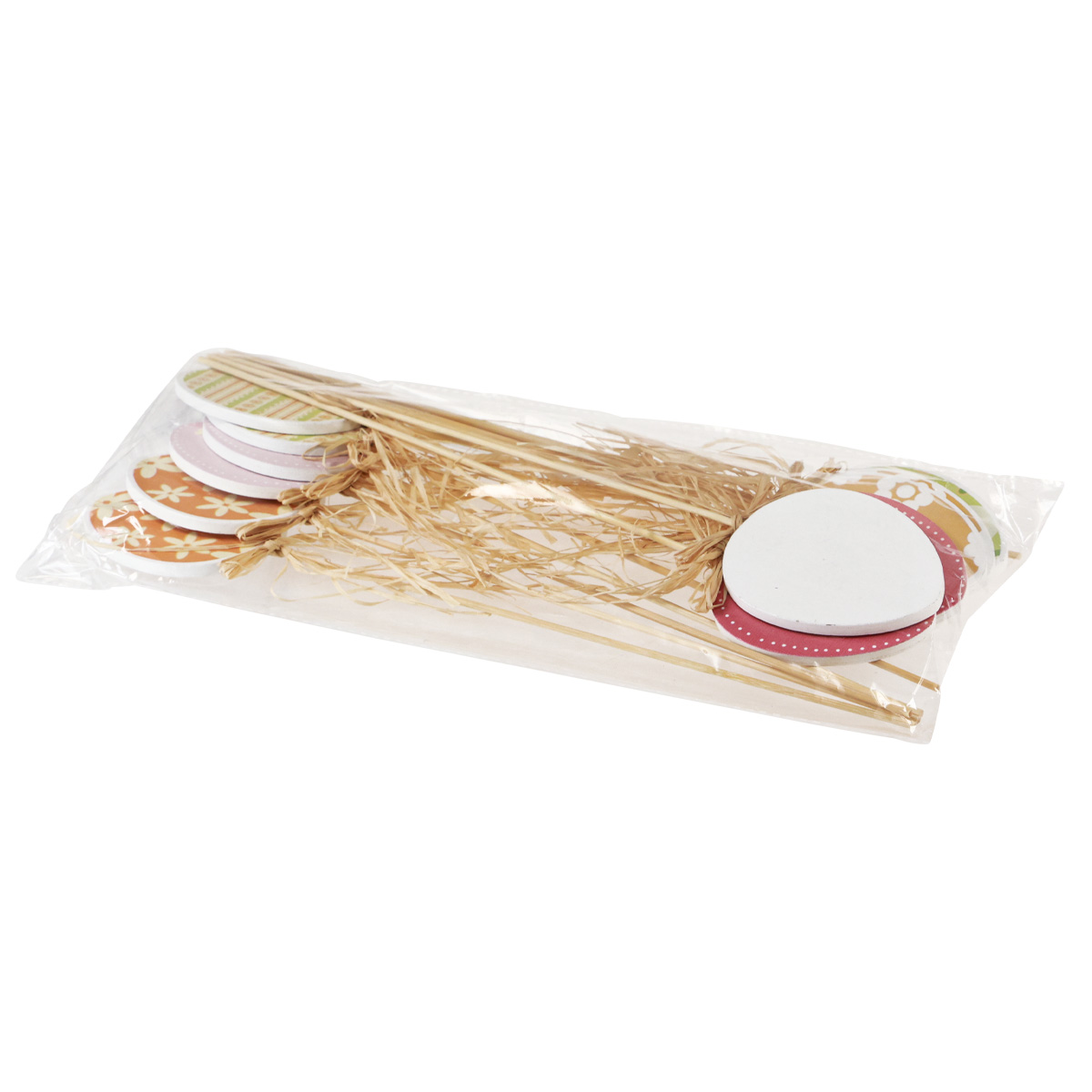 Jedes der flachen Dekoeier ist auf der Vorderseite bunt und rückseitig Weiß gehalten. Ein langer Holzstecker lässt Sie die Osterei-Deko bequem in jede Blumendeko einfügen. – So können Sie im Handumdrehen sowohl Gestecke als auch Blumensträuße mit dem hübschen Dekostecker für Ostern schmücken.