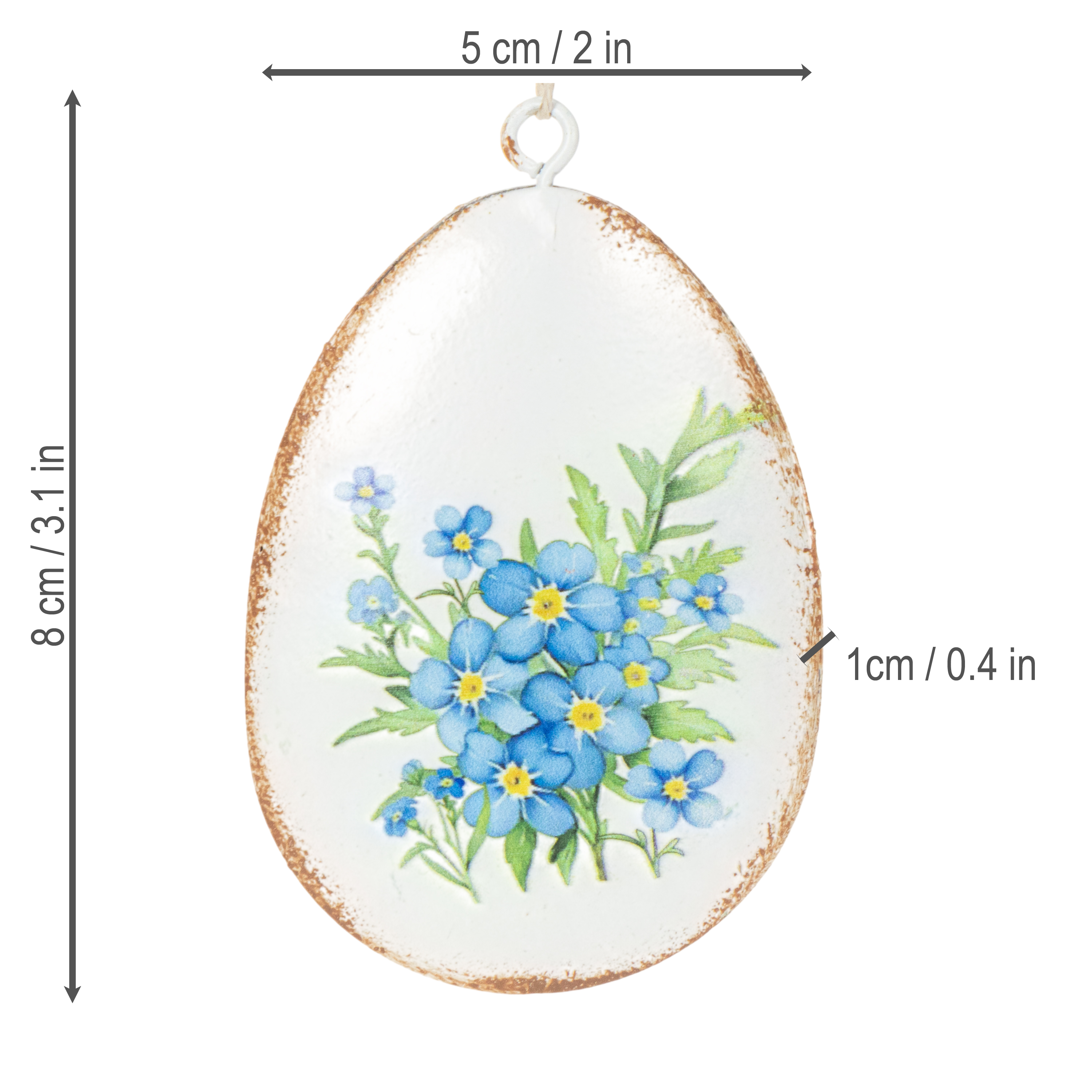 Diese dekorativen Ostereier aus Metall beeindrucken in Größe und Optik. Mit einer Höhe von 8 cm und einem Durchmesser von 5 cm bieten sie das perfekte Maß für diverse Einsatzmöglichkeiten. Die leicht matte, weiße Grundfarbe wird durch vier verschiedene Blumenmotive ergänzt, welche den Frühling hautnah erlebbar machen: von zarten Vergissmeinnicht bis hin zu leuchtenden Narzissen. Durch den dezenten Vintage-Look wirken sie besonders geschmackvoll und passen perfekt zu Retro-, Shabby-Chic- oder Landhausstil-Dekorationen.