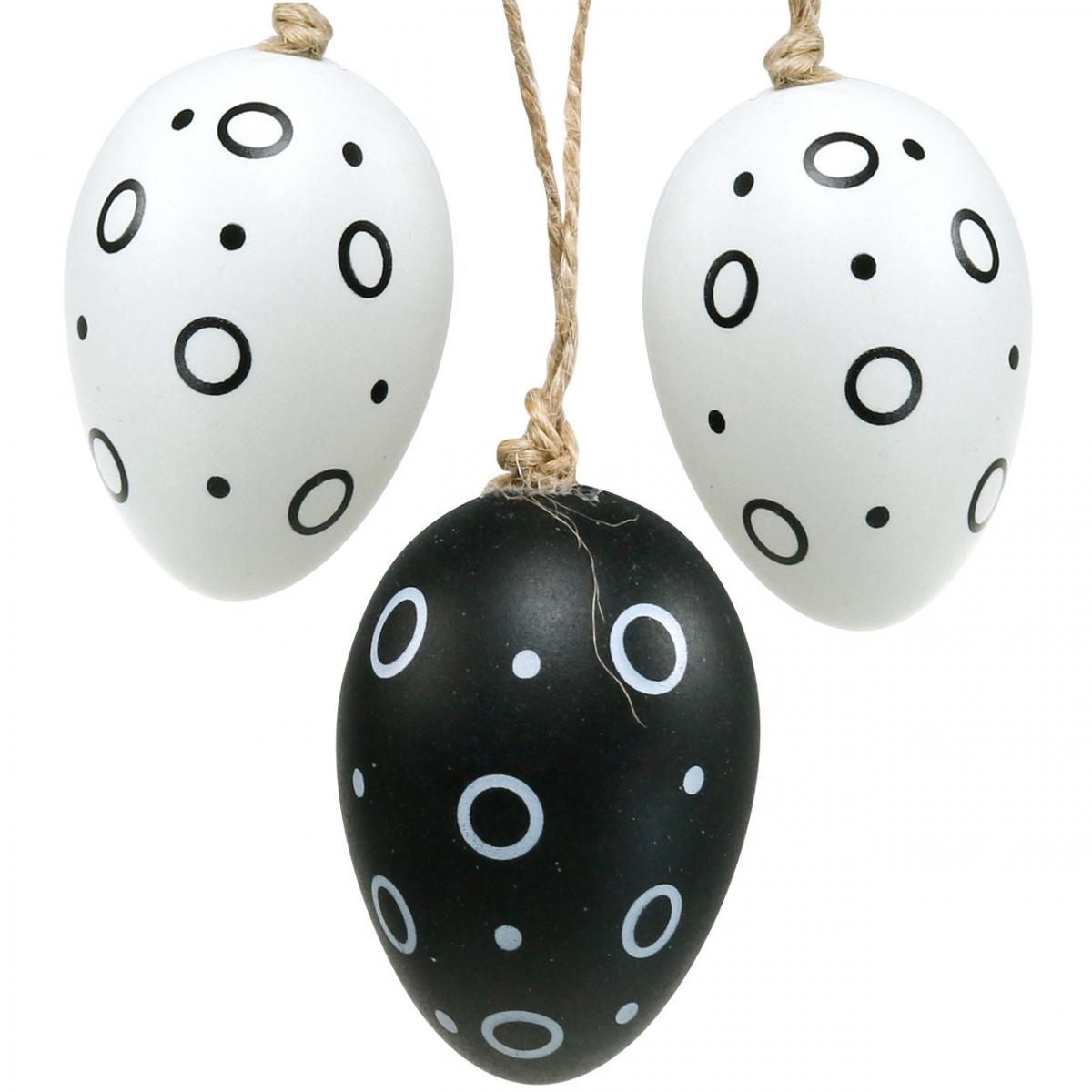 Ihr mögt es eher schlicht als bunt? Dann sind diese Deko-Eier in monochromen Schwarz-Weiß bestimmt das Richtige für Euch! Die Eier sind jeweils Matt-Weiß oder Schwarz und rundum mit einem Muster aus Ringen und Punkten in der jeweils anderen Farbe dekoriert.Geben Sie mit den schönen Deko-Ostereier österlichen Geschenken und floristischen Werkstücken wie Gestecken für den Tisch oder für den Eingangsbereich den letzten Schliff. Sie können die Ostereier zum Hängen auch an einem mit Frühblühern bepflanzten Blumenkorb oder an einem Türkranz anbringen.