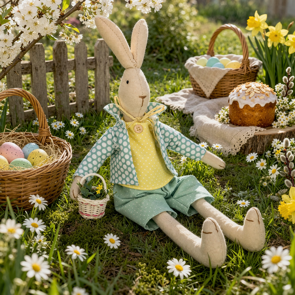Osterhasen aus Stoff wie dieser niedliche Hase mit Kleidung sind eine wunderbare Osterdeko!