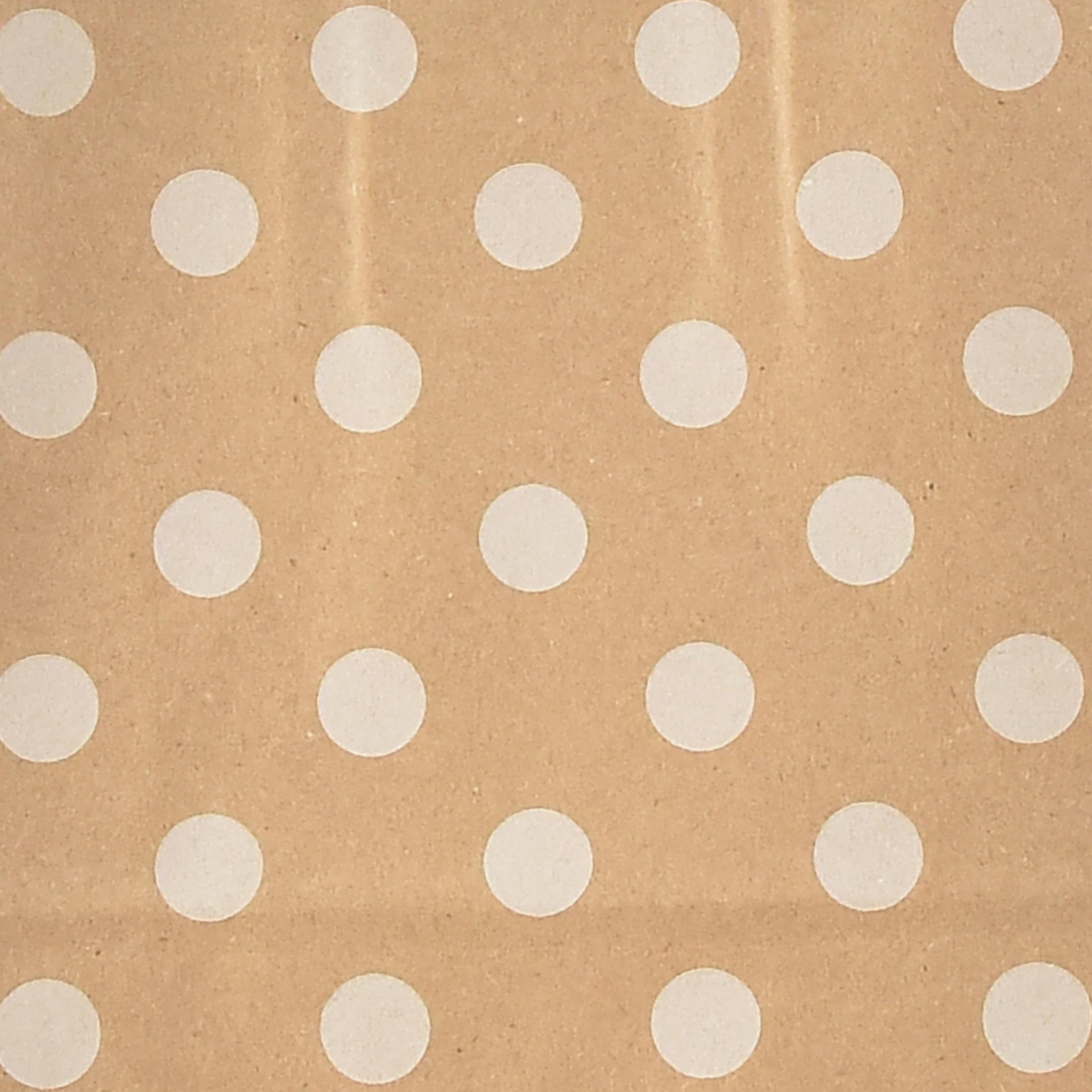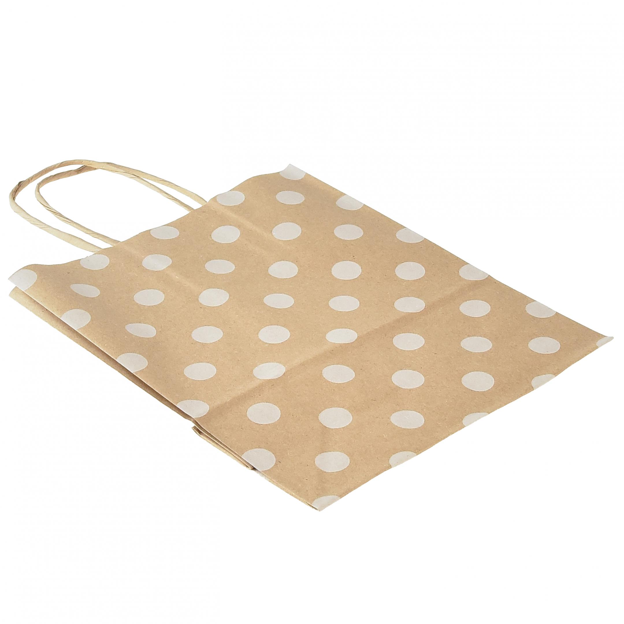 Die Papiertasche in Natur mit weißen Punkten befindet sich in einem Paket zu insgesamt 50 Stück und besitzt ungefähr die Maße 18 mal 22 mal 8 Zentimeter. Die umweltschonende Papiertüte können Sie mehrmals wiederverwenden. Damit sparen Sie nicht nur Geld, sondern vermeiden auch unnötigen Plastikabfall!