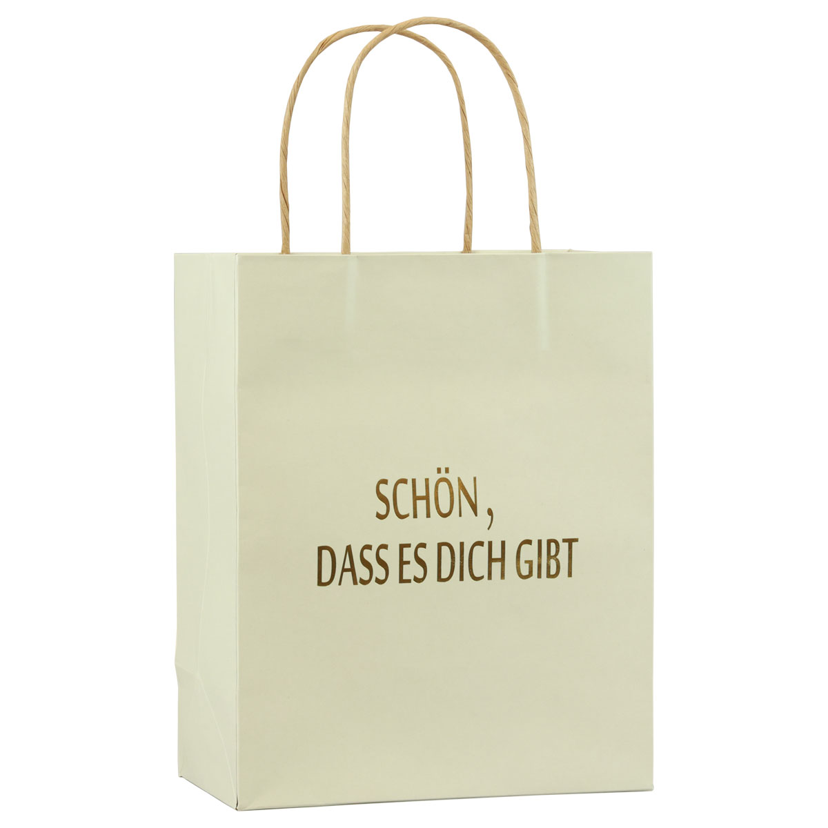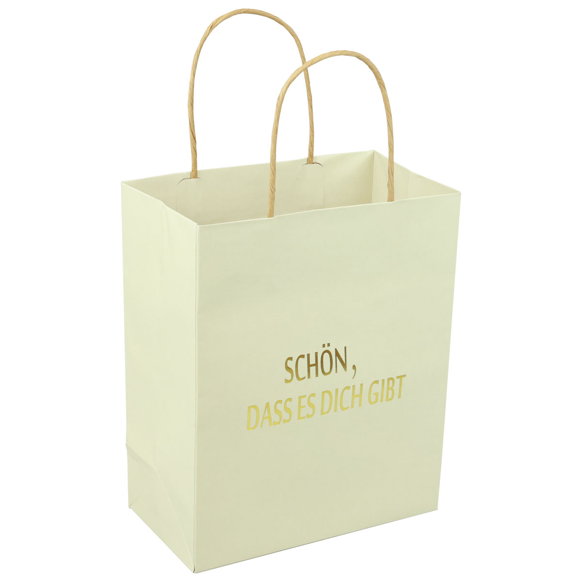 Die Geschenktüten bestehen aus dickem, außen cremefarbenem Papier und haben einen verstärkten Boden. So sind die Tüten bestens als kleine Tragetaschen geeignet. Die naturfarbenen Henkel und die goldene Prägung für Glückwunsch oder Dankeschön runden die Papiertüten wunderschön ab.