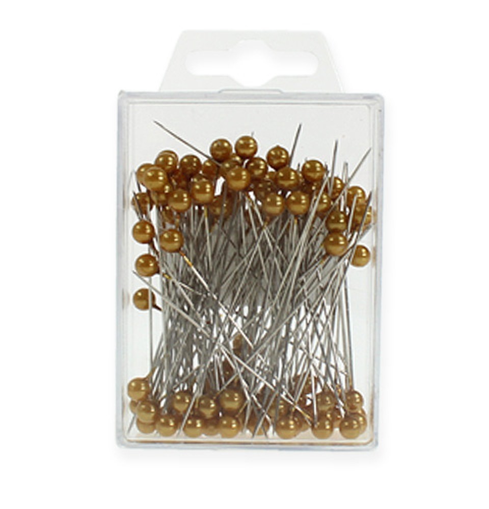 Die Perlkopfnadeln in Gold werden in einer praktischen Hängebox mit je 100 Exemplaren ausgeliefert. Eine Nadel ist etwa 65 Millimeter lang; die Perle hat einen Durchmesser von circa 6 Millimetern.