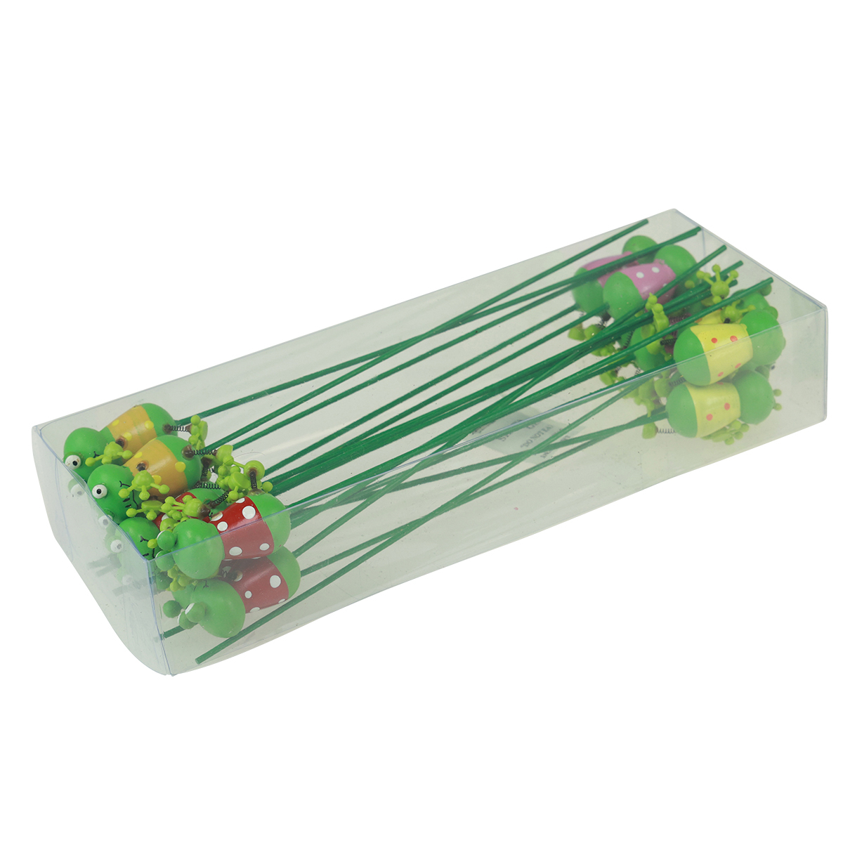 Die Frösche zum Stecken kommen vierfach farblich sortiert als Packung zu 16 Stück. Im Set enthalten sind jeweils vier Deko-Frösche am Stab jeder Farbvariation.