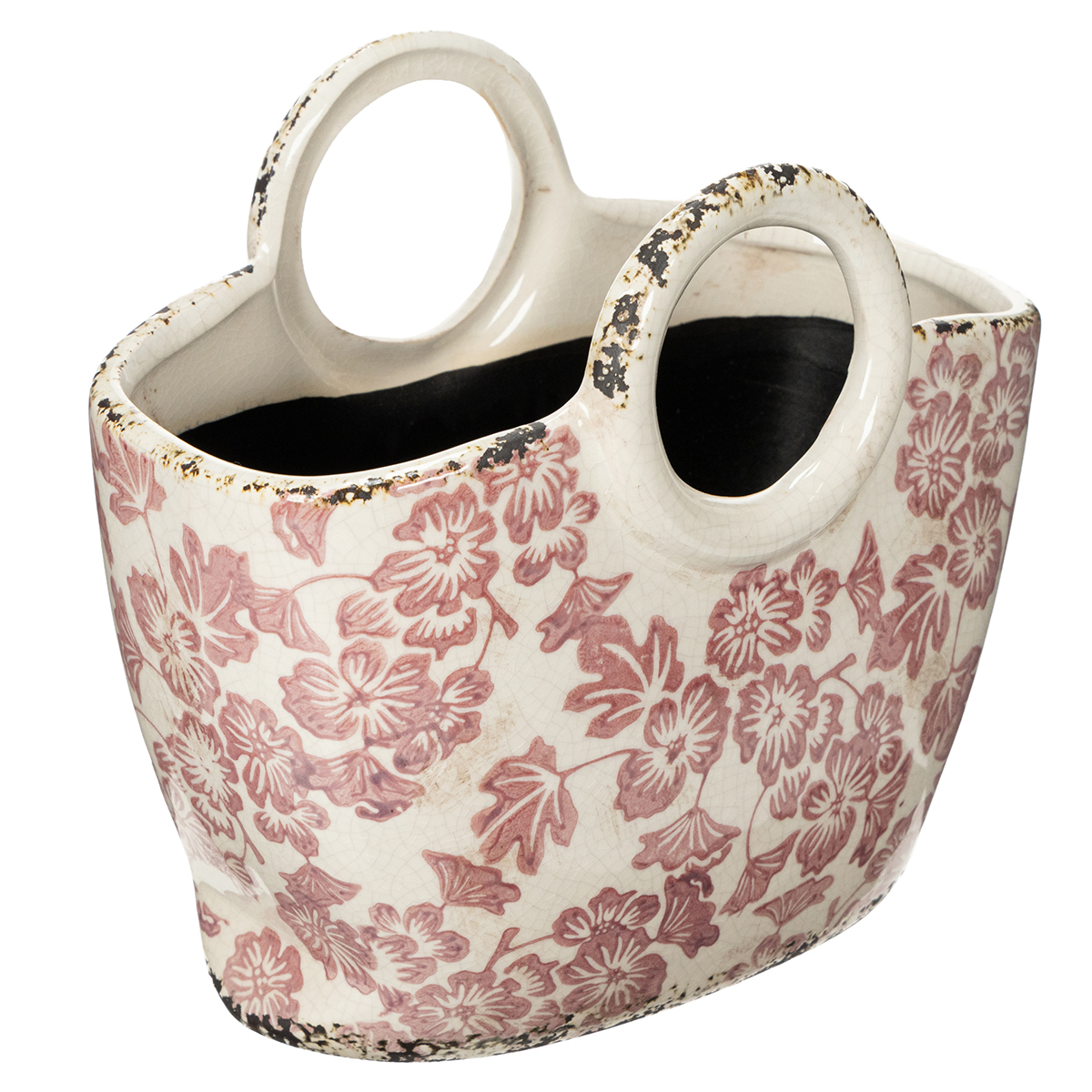 Dieser florale Keramik-Blumentopf überzeugt durch seine harmonische Verbindung aus Funktionalität und gestalterischem Stil. Die Form einer Tasche mit zwei stabilen Henkeln sorgt nicht nur für eine außergewöhnliche Optik, sondern erleichtert auch das Handling. Ob Drinnen oder Draußen – der Pflanzentopf macht überall eine gute Figur. Mit einer Länge von 21 cm, einer Breite von 13 cm und einer Höhe von 18 cm bietet er genügend Platz für kleinere Grünpflanzen oder liebevoll arrangierte Blumensträuße. Seine robuste Verarbeitung aus hochwertiger Keramik gibt ihm Stabilität, während das leichte Spiel aus Weiß und Rot dem Topf eine romantische und zugleich frische Ausstrahlung verleiht.