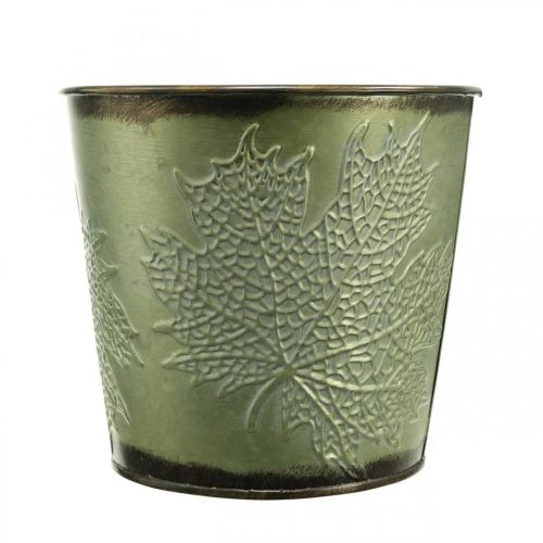 Pflanzgefäß für den Herbst, Übertopf mit Blattdekor, Metalleimer Grün Ø14cm H12,5cm