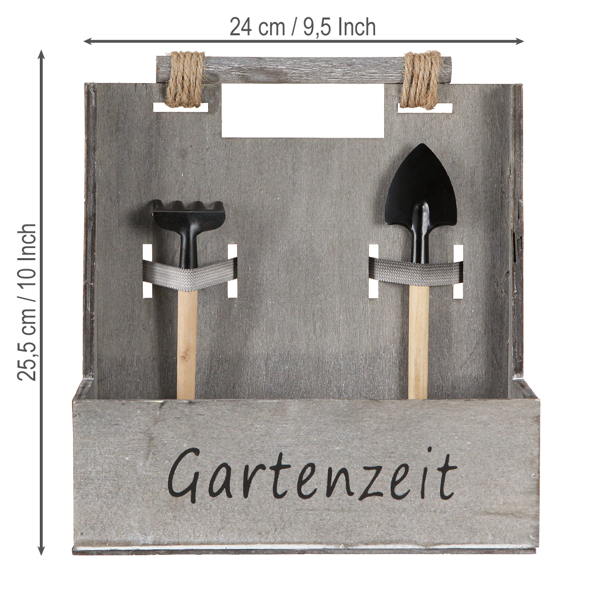 Produktname: Pflanzkasten „Gartenzeit“ mit Werkzeug Deko Grau 24×10×25cm
