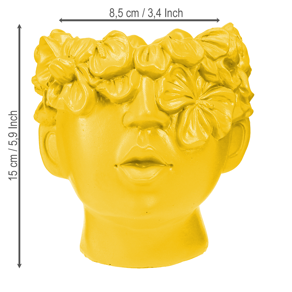 Der Pflanzkopf in leuchtendem Gelb ist ein außergewöhnlicher Blickfang, der Ihre Wohnräume mit einem Hauch von Kreativität und Farbe bereichert. Gefertigt aus hochwertigem Polyresin, beeindruckt dieser Übertopf nicht nur durch seine lebendige Farbausstrahlung, sondern auch durch die sorgfältig modellierten Details. Mit den Maßen von ungefähr 13,5×13×14 cm eignet sich dieser Übertopf ideal für kleine Zimmerpflanzen. Die gelbe Farbe steht in der Farbpsychologie für Freude und positive Energie, was ihn perfekt für ein einladendes und warmes Raumambiente macht. Stellen Sie diesen Pflanzkopf in Ihrem Wohnzimmer, auf der Fensterbank oder als zentrales Dekorationselement im Eingangsbereich auf. Lassen Sie sich inspirieren und setzen Sie Akzente in Ihrem Zuhause. Der kunstvoll gestaltete Pflanzkopf bringt frischen Wind in Ihre Dekorationsideen und eignet sich besonders für Einrichtungsstile wie Boho und modern.