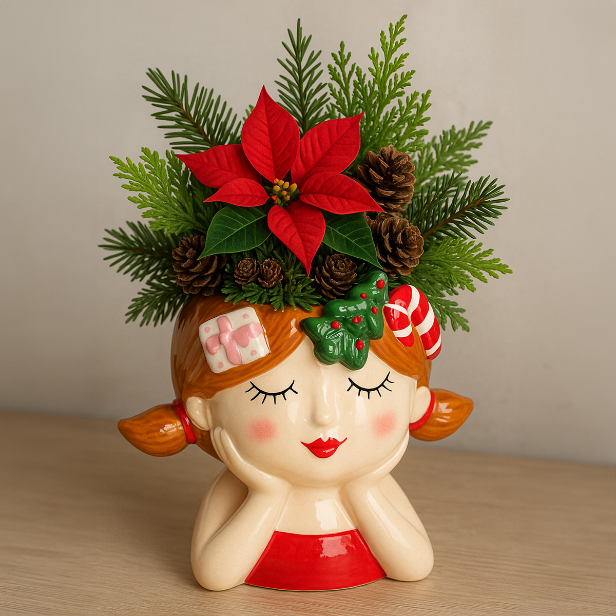 Weihnachten steht vor der Tür, und Sie suchen etwas, das Ihre festliche Dekoration wirklich einzigartig macht? Dann wird Ihnen dieser bezaubernde Pflanzkopf aus Keramik sofort ein Lächeln ins Gesicht zaubern! Mit seinem charmanten Design in Form eines träumenden Mädchens mit Weihnachtsdeko im Haar bringt dieser Pflanzkopf nicht nur fröhliche Weihnachtsstimmung in Ihre vier Wände, sondern setzt auch jede Pflanze oder Ihre Adventsdeko wundervoll in Szene. Besonders auffällig sind die liebevollen Details der Büste wie die roten Schleifenbänder, ihr verträumter Blick und die kleinen weihnachtlichen Elemente wie ein Mini-Christbaum und eine Zuckerstange in ihrem Haar. So ist der Übertopf perfekt für jeden, der seine Dekorationen mit einem Augenzwinkern verschönern möchte!