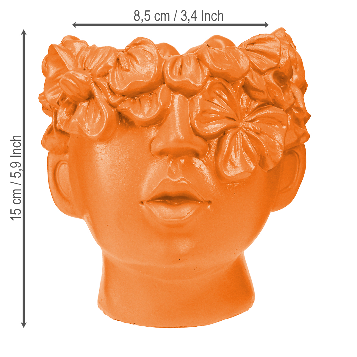 Der Pflanzkopf als Übertopf in leuchtendem Orange bringt frischen Wind in Ihre Innenraumgestaltung. Mit seinen Maßen von circa 13,5x13x14 cm ist dieser dekorative Pflanztopf die ideale Wahl für den Schreibtisch, das Regal oder als stilvolle Schreibtisch-Dekoration. Hergestellt aus hochwertigem Polyresin, vereint der Pflanztopf moderne Ästhetik mit einzigartigem Design, das Ihrem Zuhause Sommerstimmung bringt. Die Büste mit floralen Details schafft einen kreativen Akzent, der sowohl alleine als auch in Kombination mit anderen Wohnaccessoires von Floristik24 überzeugt. Der orange Übertopf passt perfekt in ein modernes Ambiente und kann wunderbar mit anderen orangefarbenen Dekorationsartikeln harmonieren, um einen lebendigen Farbtupfer zu setzen. Integrieren Sie dieses Designer-Pflanzgefäß in Ihren Wohnbereich und nutzen Sie die vielseitigen Möglichkeiten, die er bietet, um ein inspirierendes und zugleich harmonisches Raumgefühl zu kreieren.