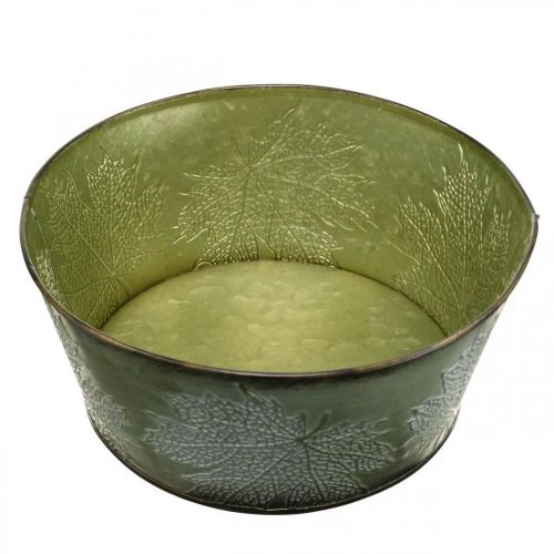 Produktname: Pflanzschale mit Ahornblättern, Herbstdeko, Metallgefäß Grün Ø25cm H11cm