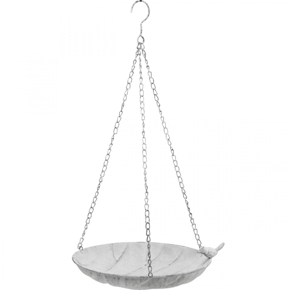 Schale und Ketten des fast runden Tellers sind aus Metall und mit einer weißen Patina veredelt worden. Die drei Ketten sind mit einem Haken verbunden, damit sich die Hängeschale überall gut befestigen lässt. Wie bei einem Blatt hat die runde Metallschale verspielte Adern. Auf dem Rand des hängenden Deko-Tabletts hockt ein Vögelchen und pfeift vergnügt ein Lied.