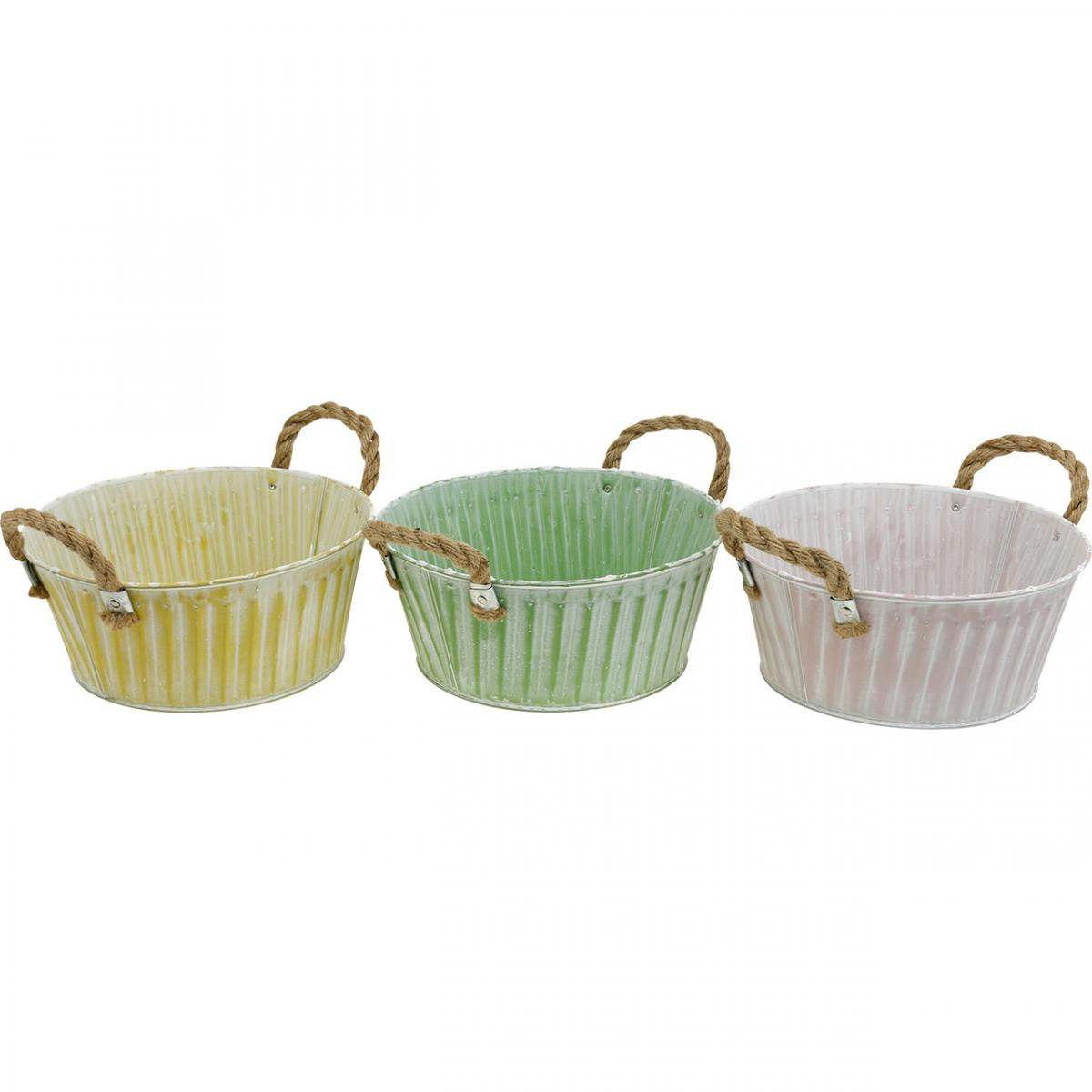Pflanzschale aus Metall, Blumenschale, Pflanztopf mit Henkeln Rosa/Grün/Gelb Shabby Chic Ø22cm H9,5cm 3er-Set