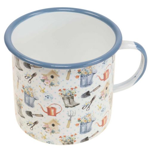 Werkzeuge und Gartenutensilien wie Harken, Schaufeln, Scheren, Wassserzerstäuber und Gießkannen sind auf der Emaille-Tasse zu sehen. Besonders liebenswert sind die mit Blumen befüllten Gießkannen und Gartenstiefel. Auch kleine Vogelhäuschen, die mit Blumen geschmückt sind, zieren die Pflanztasse.