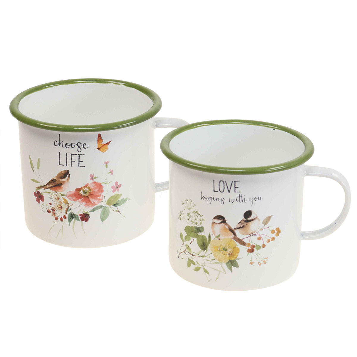 Der Deko-Becher ist emailliert, weiß gefärbt und mit einem grünen Rand versehen. Den Becher gibt es mit einem der beiden Sprüche „Choose Life“ oder „Love begins with you“.