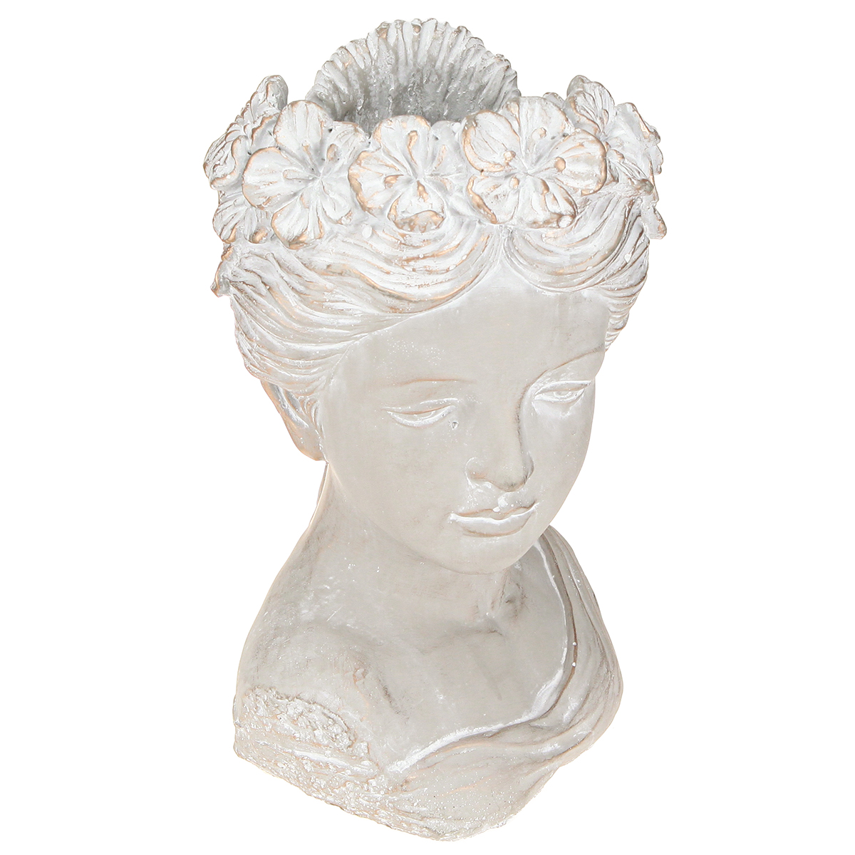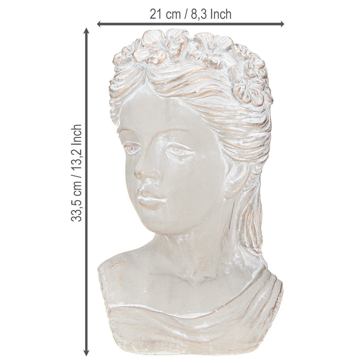Der Pflanztopf ist als Skulptur einer Frau aus Steinguss in antiker Optik gestaltet und bietet den perfekten Blickfang für jeden Raum. Mit seinen Maßen von ungefähr 21×17,5×33,5 cm vereint er elegante Ästhetik und funktionalen Nutzen in einem einzigartigen Dekorationsobjekt. Die detaillierte Ausarbeitung der Gesichtszüge und Haare, die an klassische Skulpturen erinnert, verleiht diesem Pflanzgefäß eine besondere Note. Der Frauenkopf, verziert mit einem Blumenkranz, bringt antikes Flair in Ihr Zuhause. Die grazile Form und die robuste Verarbeitung machen die Büste zu einem langlebigen Accessoire für Ihren Garten oder Ihre Innenräume. Der Pflanztopf fügt sich wunderbar in verschiedene Einrichtungsstile ein, sei es Landhaus, klassisch oder Shabby Chic. Durch die Kombination von weißen und goldenen Akzenten auf grauem Grund entsteht ein harmonisches Gesamtbild. Perfekt geeignet für Dekorateure, DIY-Enthusiasten und alle, die das Besondere lieben.