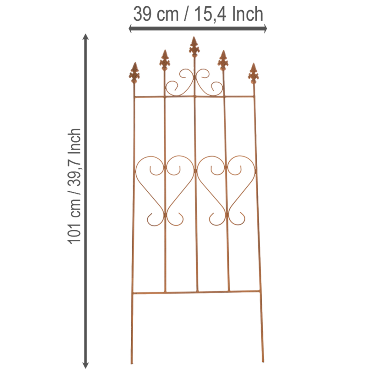 Lassen Sie Ihren Garten erblühen! Das Rankgitter mit seinem nostalgischen Herzmotiv verströmt nicht nur einen Hauch von Romantik, sondern ist auch praktisch einsetzbar. Ideal für Rosen oder als charmante visuelle Abgrenzung im Garten – dieses Rankgitter verleiht jedem Außenbereich das gewisse Etwas. Die Maße von 101 Zentimetern Höhe, 39 Zentimetern Breite und 1 Zentimeter Tiefe machen es dabei handlich und platzsparend zugleich. Der braune Edelrost-Look harmoniert besonders gut mit natürlichen Grüntönen und blühenden Farben. Ob auf der Terrasse, im Vorgarten oder als dekorative Ergänzung zu Blumenbeeten – dieses Rankgitter ist ein unverzichtbares Wohnaccessoire für jeden Naturliebhaber.