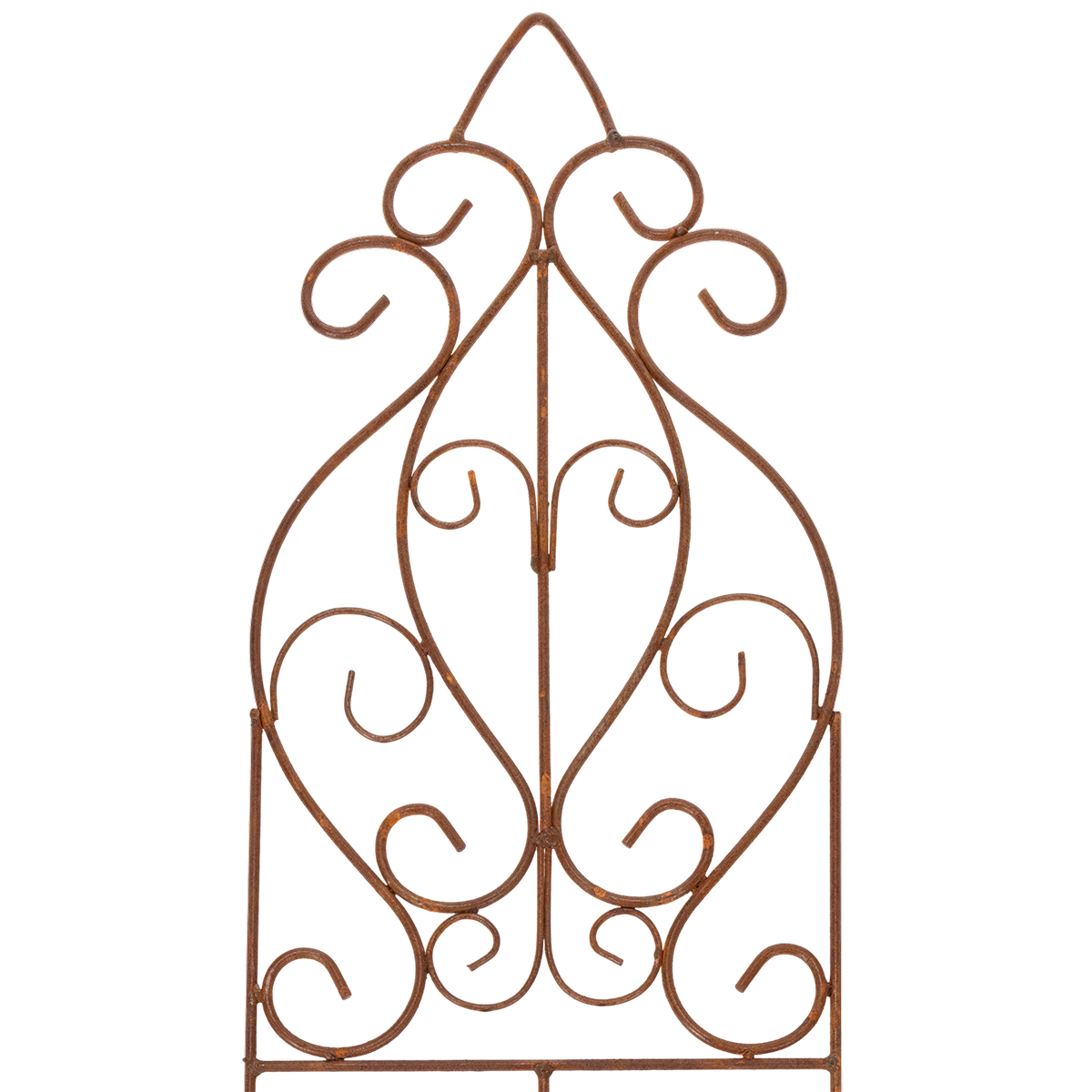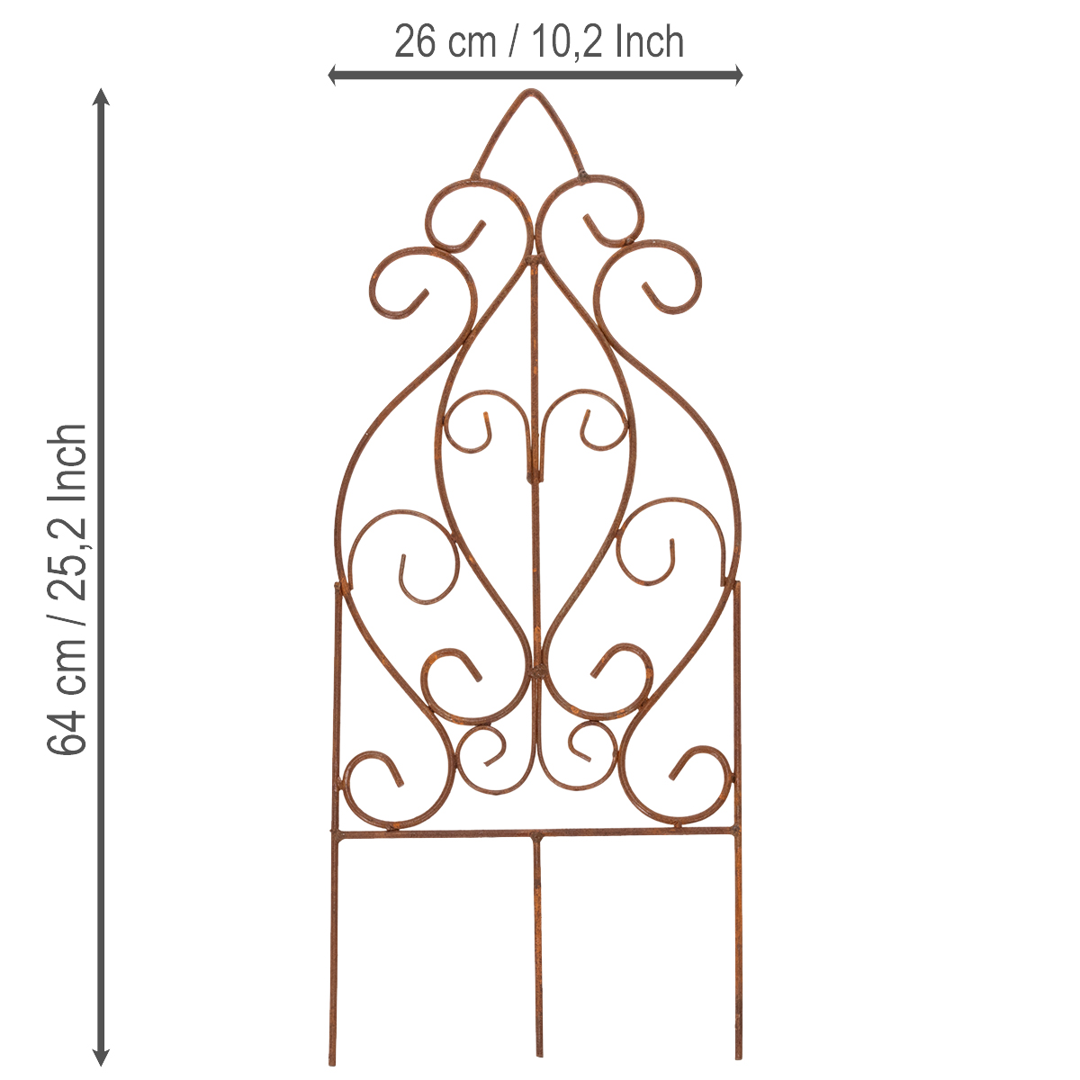 Träumen Sie von einem Gartenparadies, das Sie jeden Tag aufs Neue verzaubert? Mit dem Rankgitter aus Metall in edler Rost-Optik schaffen Sie im Handumdrehen ein romantisches Highlight, das Ihre Rosen oder Kletterpflanzen stilvoll in Szene setzt. Ob als Zierde im Rosenbeet, als dezenter Hingucker im Vorgarten oder als elegante Unterstützung für Ihre Pflanzen im Blumenbeet – dieses Rankgitter verbindet Funktionalität mit einem dekorativen Charme, der Eindruck macht. Gefertigt aus hochwertigem Metall, ist es nicht nur robust, sondern setzt mit seiner warmen braunen Farbgebung und den geschwungenen Verzierungen ganz besondere Akzente. Dank seiner Maße von 64 cm Höhe und 26 cm in der Breite passt es als Rankhilfe vielseitig in Ihre Gartengestaltung und zaubert eine stimmungsvolle Atmosphäre im Frühling, Sommer und darüber hinaus.