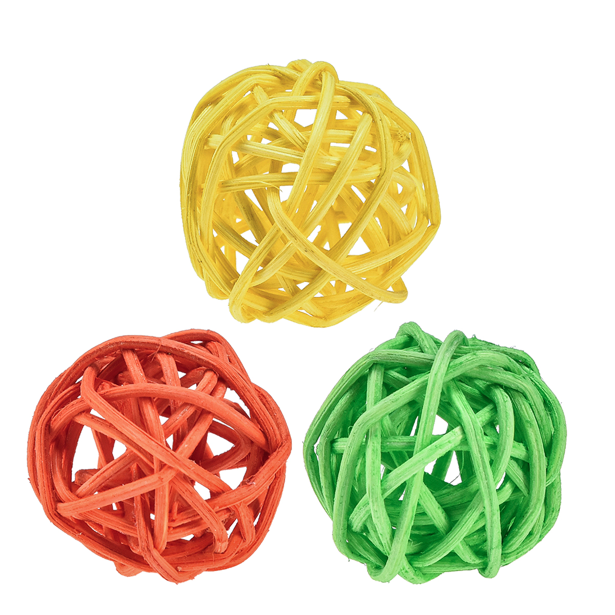Der sortierte Mix enthält insgesamt 30 Rattanbälle in den Farben Orange, Gelb und Grün, 10 von jeder Sorte. Die kleinen Kugeln haben dabei jeweils einen Durchmesser zwischen ungefähr 3 Zentimetern.