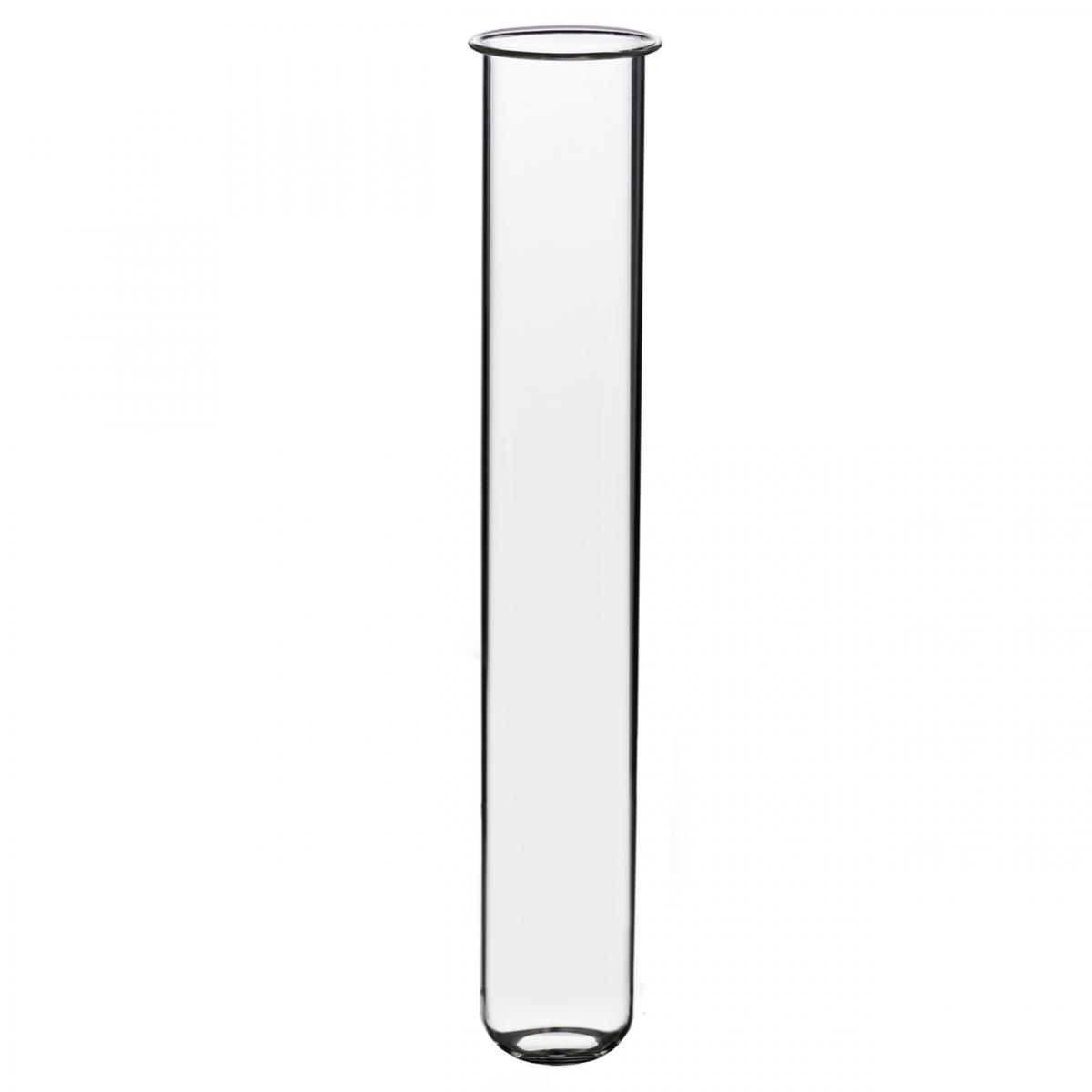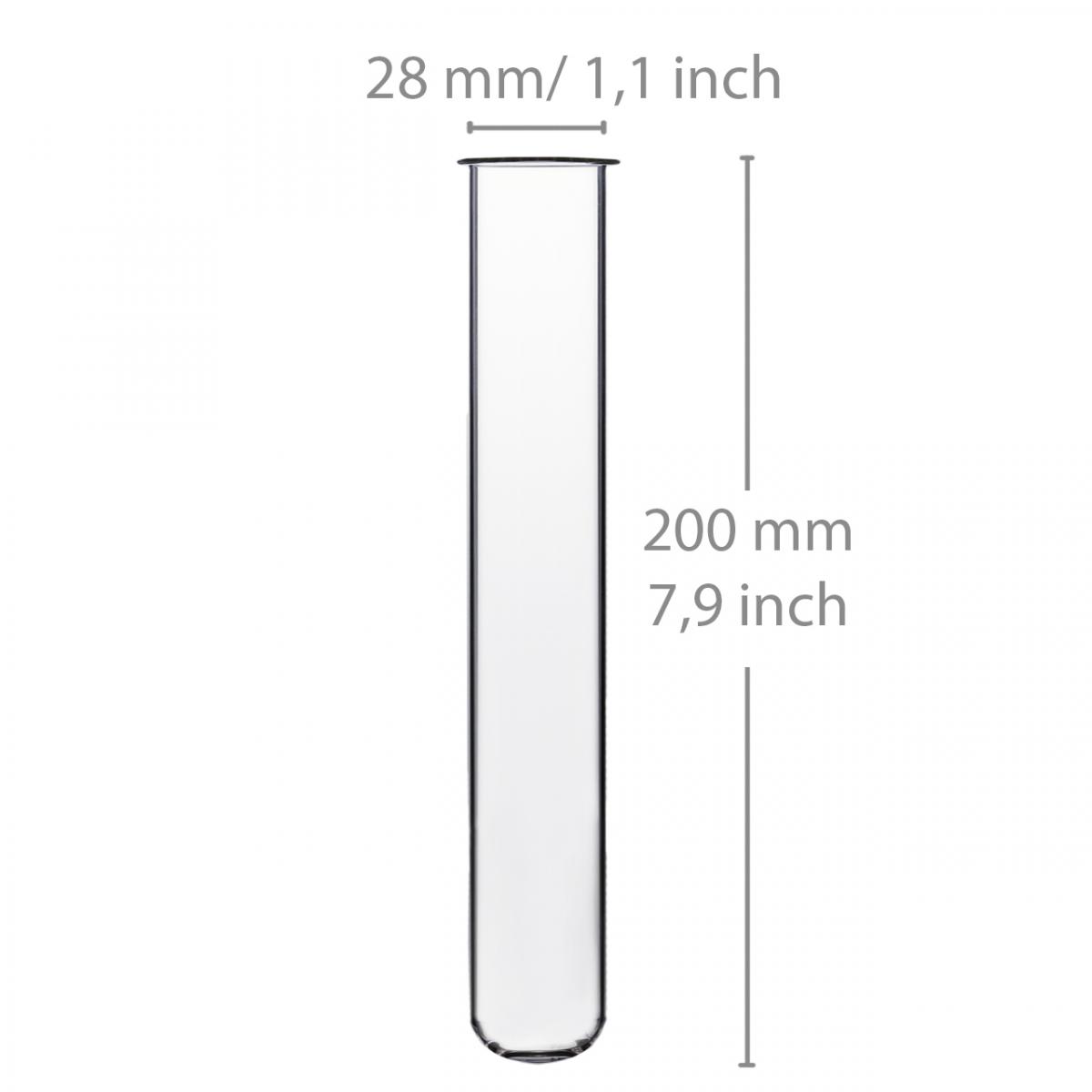 Das Reagenzglas besitzt einen gebördelten Rand, wodurch sich ein Außendurchmesser von etwa 34 Millimetern ergibt, während der Innendurchmesser bei ungefähr 27 Millimeter liegt. Insgesamt ist das Blumenröhrchen circa 200 Millimeter lang.
