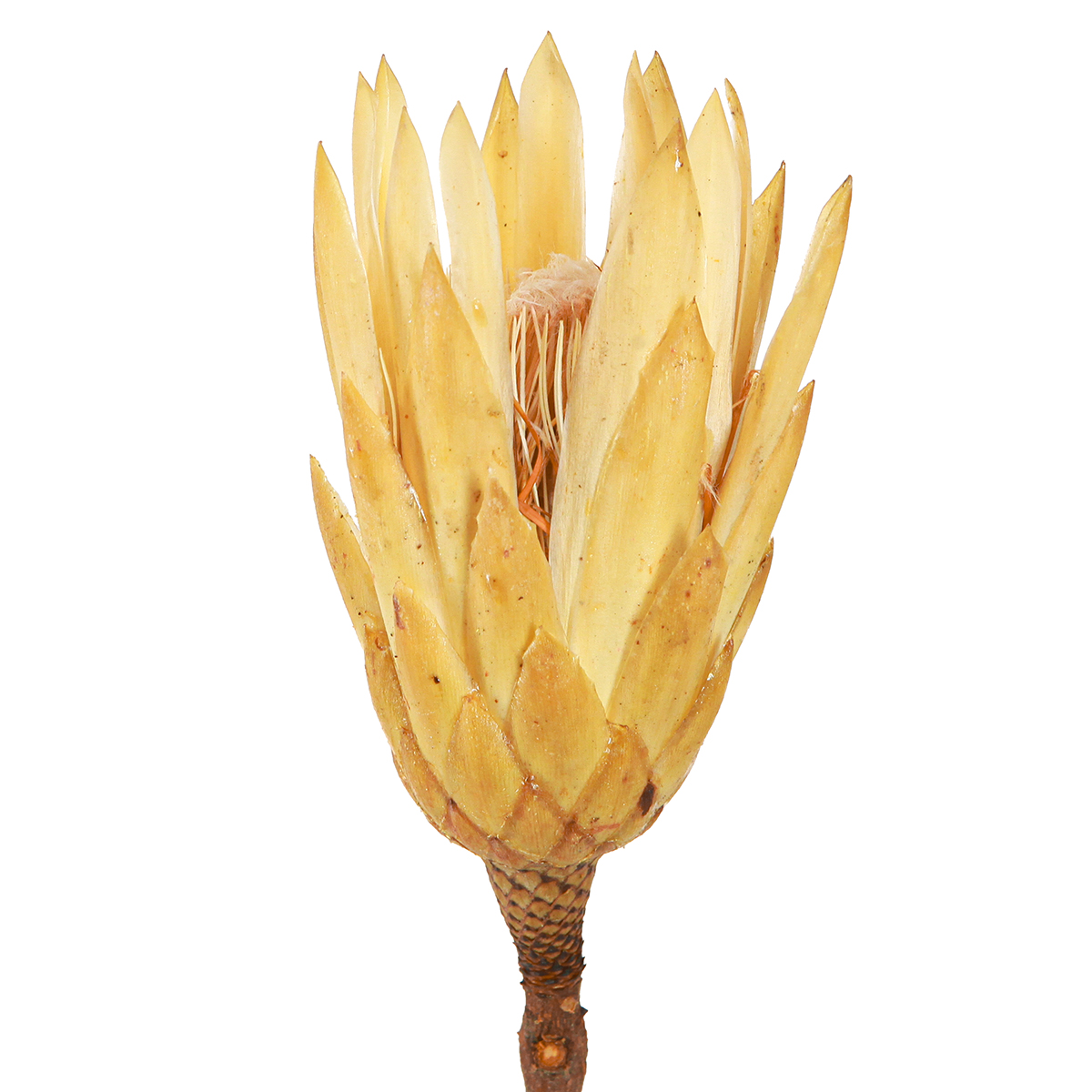 Mit den getrockneten Proteen am Stiel können Sie unter anderem geschmackvolle Grabgestecke und Trauerkränze für den Totensonntag und andere Gedenktage wirkungsvoll abrunden. Der edle Creme-Ton der Trockenpflanzen harmoniert dabei wunderschön mit erdigen, eher dunklen Farben und zu heimischen Naturmaterialien wie Zapfen und Tannengrün passt die Protea Repens sehr gut.