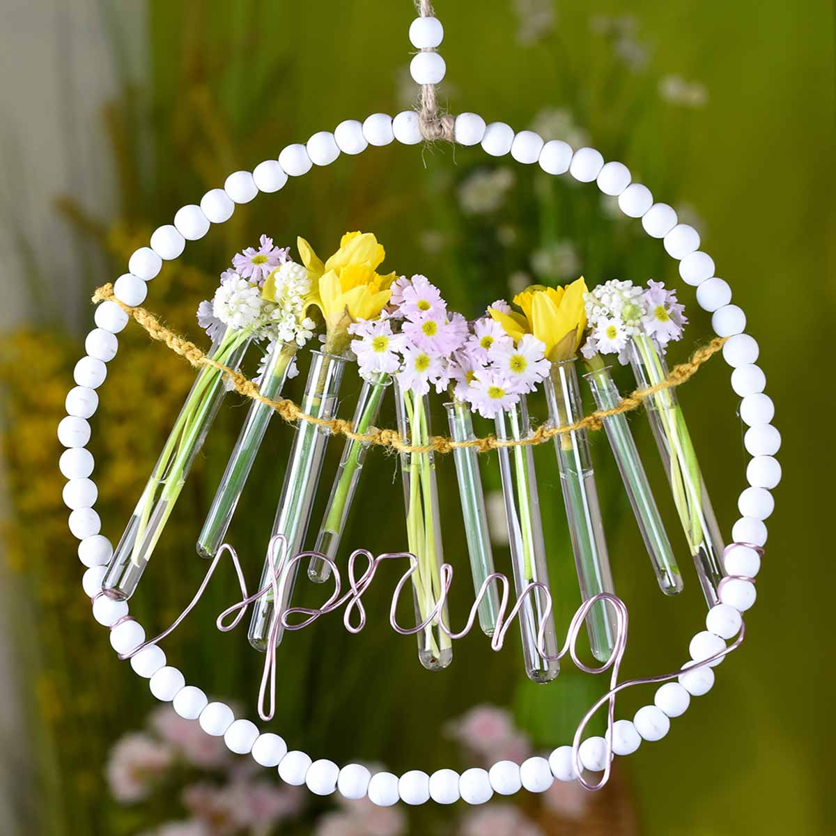 Nutzen Sie den Dekokranz schlicht wie er ist oder verzieren Sie ihn je nach Anlass und Jahreszeit mit Bändern, Blumen, Dekoranken oder Schmuckanhängern auch Reagenzgläser oder kleine Windlichter zum Hängen die Sie sowohl in den Kranz als auch daran hängen können eignen sich toll zum ausgestalten des Kranz aus Perlen.