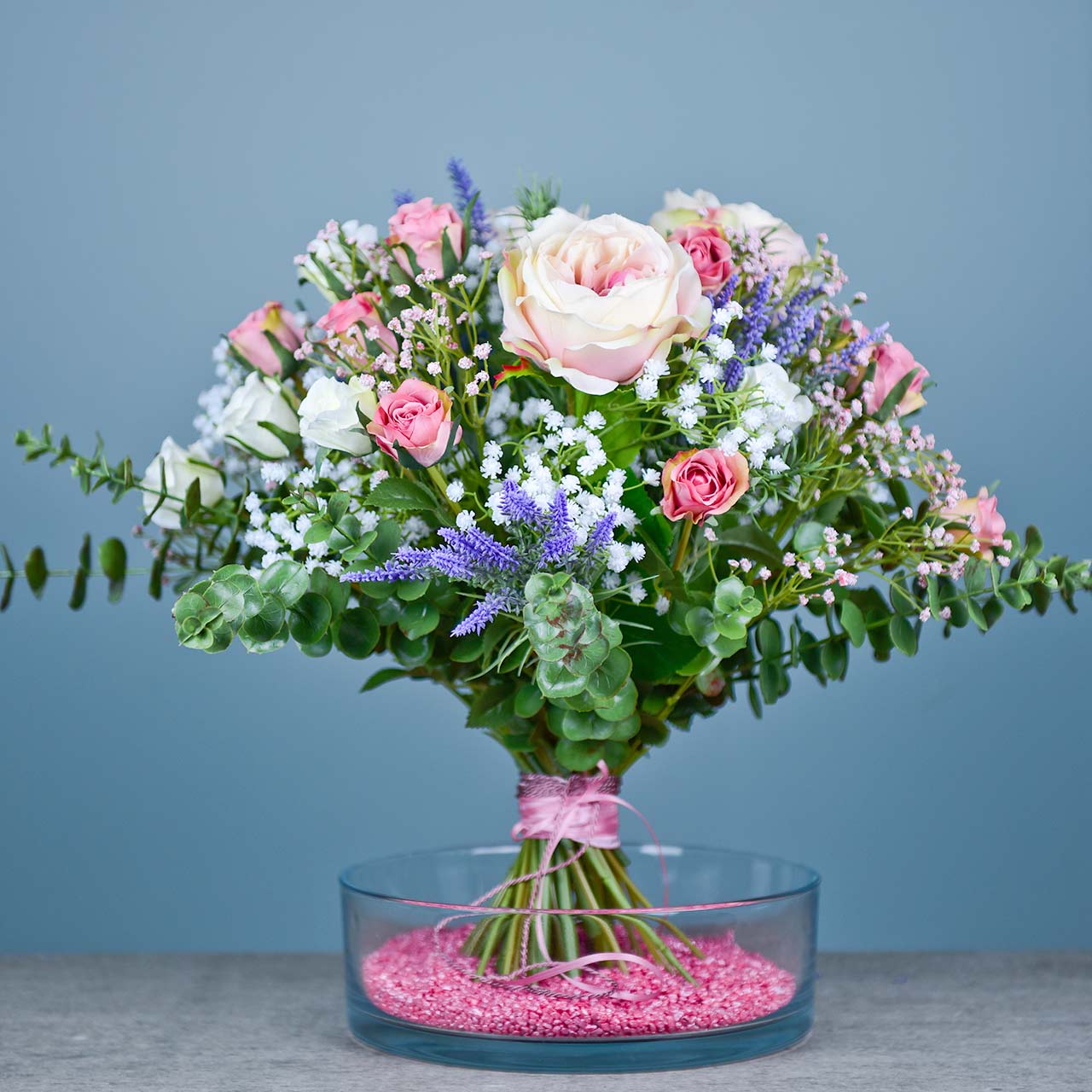 Das klassische Gebinde aus Textilmaterial und Kunststoff, das von einem Band aus Naturbast zusammengehalten wird, passt als zeitlose Blumenkomposition überallhin: Ob als Dekoration zuhause, in einem Hotel oder einem Restaurant, ob einzeln als Streudeko oder Akzente in einem größeren Arrangement oder als kompletter Strauß in einer edlen Vase – das schlichte Rosenbukett ist für jeden Anlass geeignet. Die Möglichkeiten sind endlos: Verschönern Sie mit den natürlich aussehenden Blüten die einzelnen Tische auf Ihrer Hochzeit.